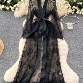 2pcs, Elegant Long Bathrobe, Transparent Kimono, Long-sleeved Lace Transparent Long Dress, Sexy Deep V See-through Drawn-out One-piece DressIncluding Robe And Belt, A Choice For A Romantic Night