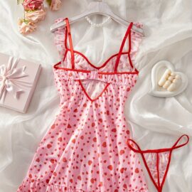 Heart-Patterned Lingerie Dress with Ruffled Hem And Bow, Paired with a Thong.