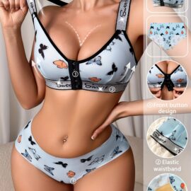 A Set of Butterfly Print Front-Button Women’S Lingerie, Featuring Wide Straps, a Wireless Bra, And Seamless Panties, Soft And Comfortable, Perfect for Everyday Wear in Autumn And Winter.
