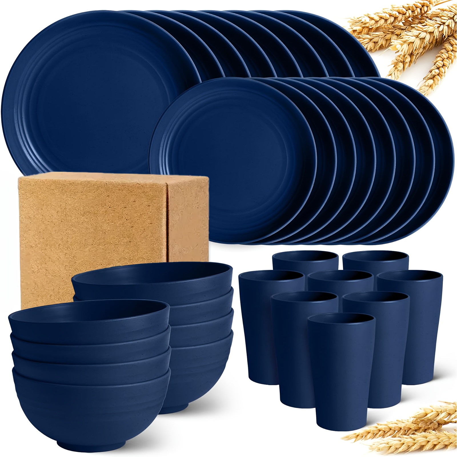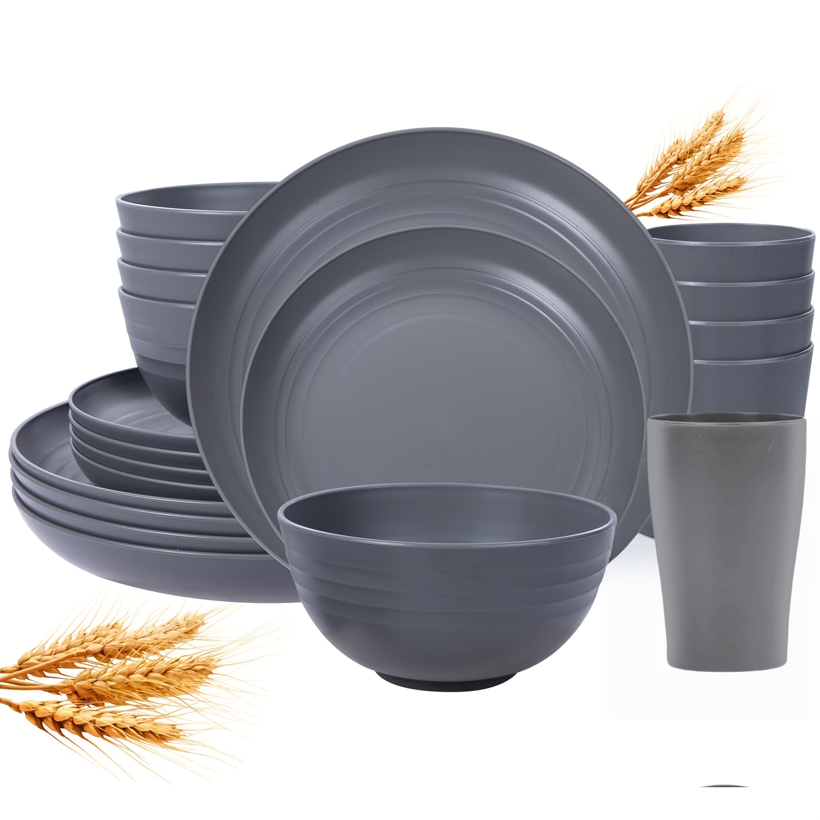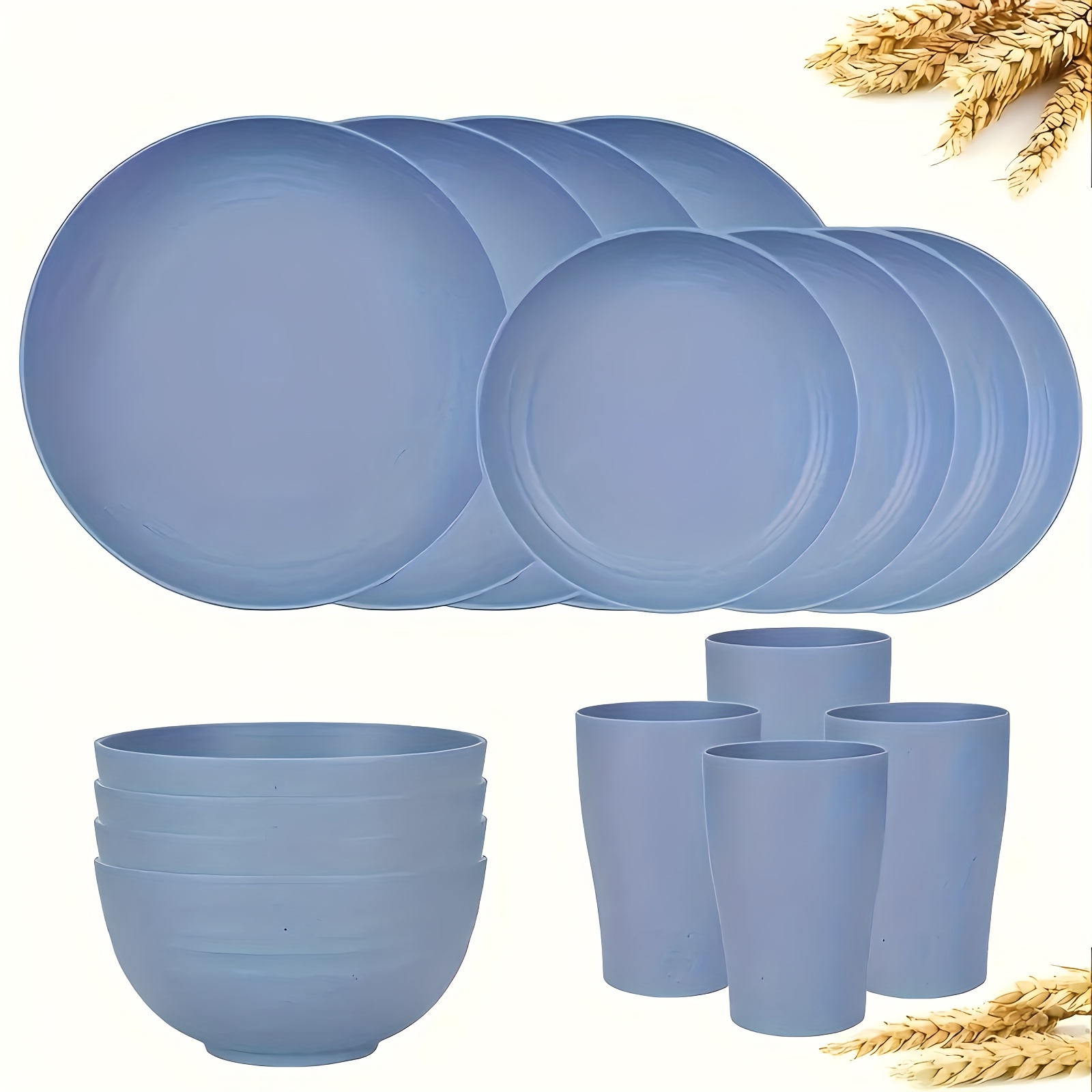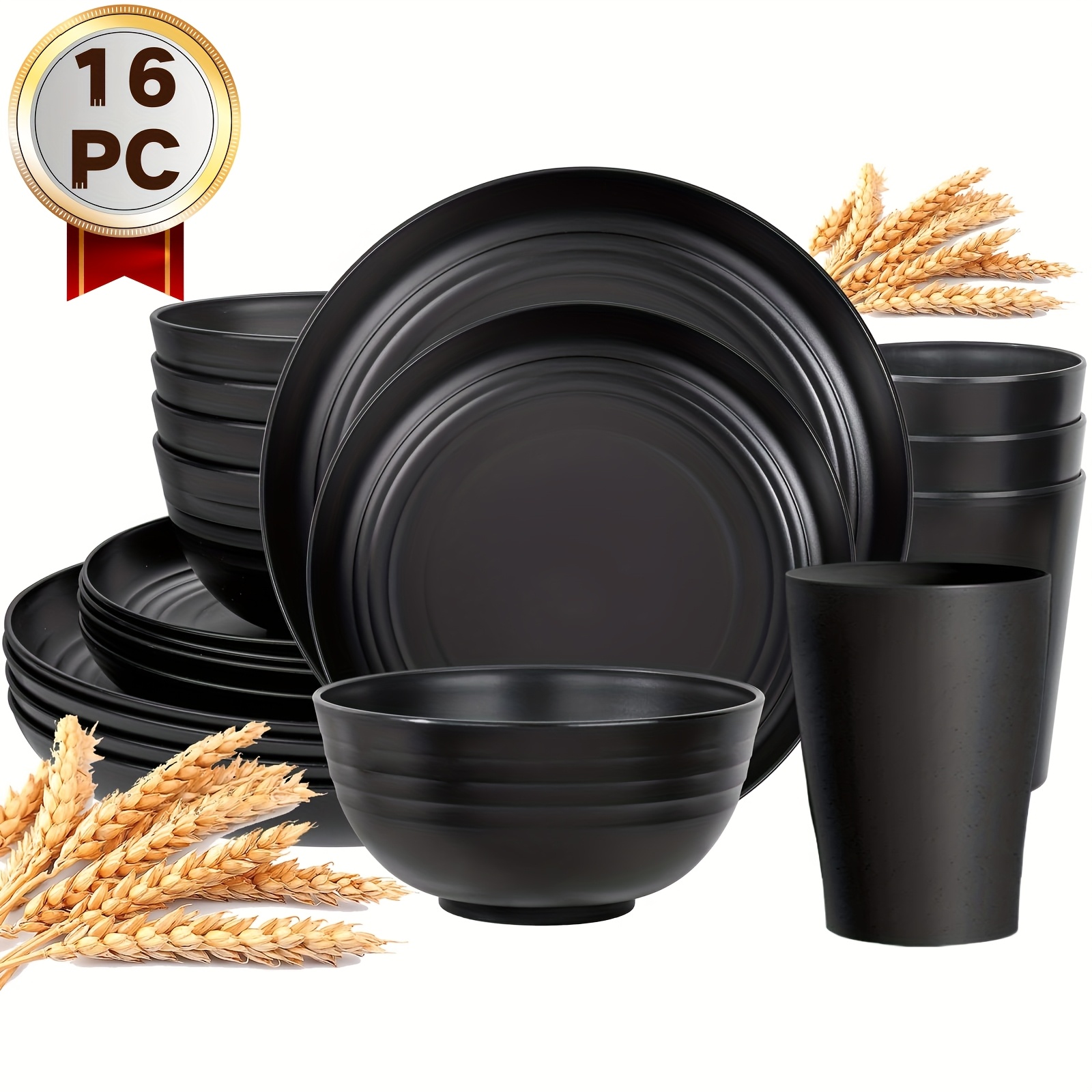 16/32pcs Kitchen Plastic Wheat Straw Tableware Set, 4/8 People, Plates, Dessert Plates, Cereal Bowls, Cups, Unbreakable, Lightweight Shatterproof for Camping/Daily Use/Parties/Weddings, Gift for Halloween/Christmas, Local Warehouse Item