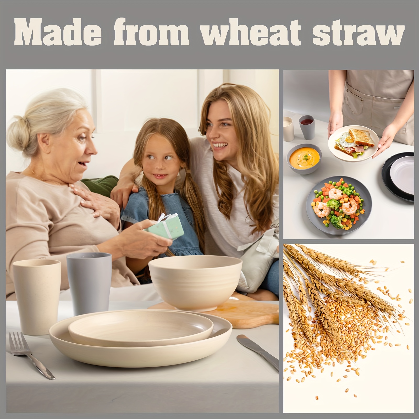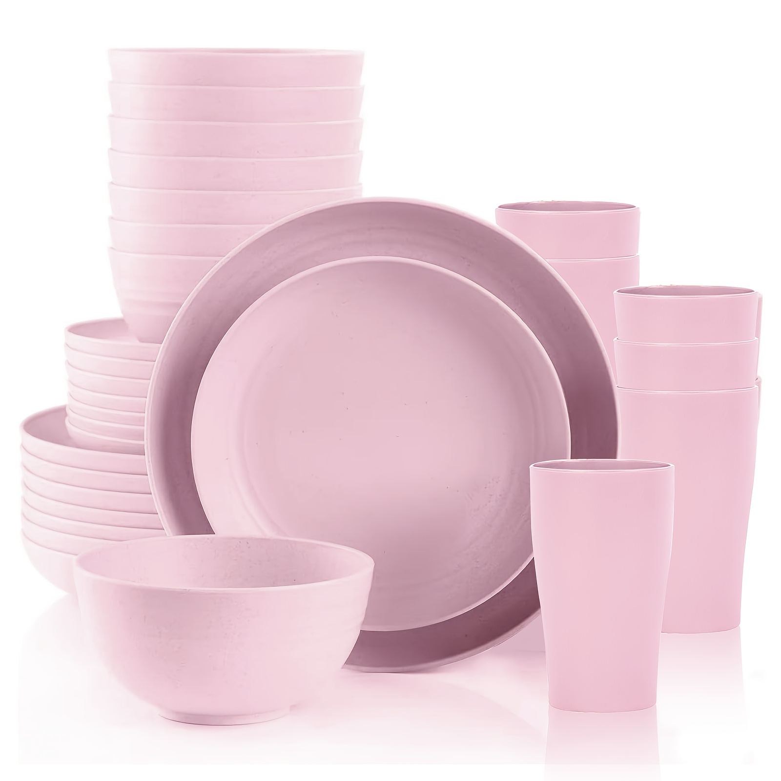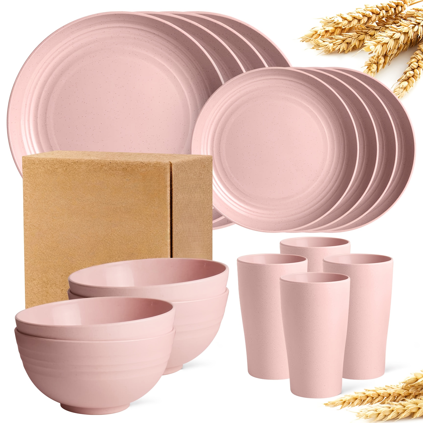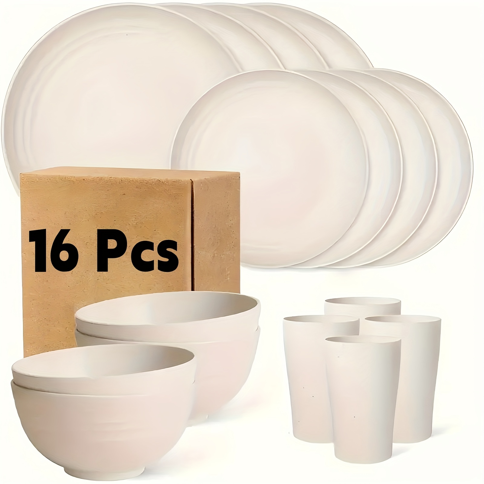 16/32pcs Kitchen Plastic Wheat Straw Tableware Set, 4/8 People, Plates, Dessert Plates, Cereal Bowls, Cups, Unbreakable, Lightweight Shatterproof for Camping/Daily Use/Parties/Weddings, Gift for Halloween/Christmas, Local Warehouse Item