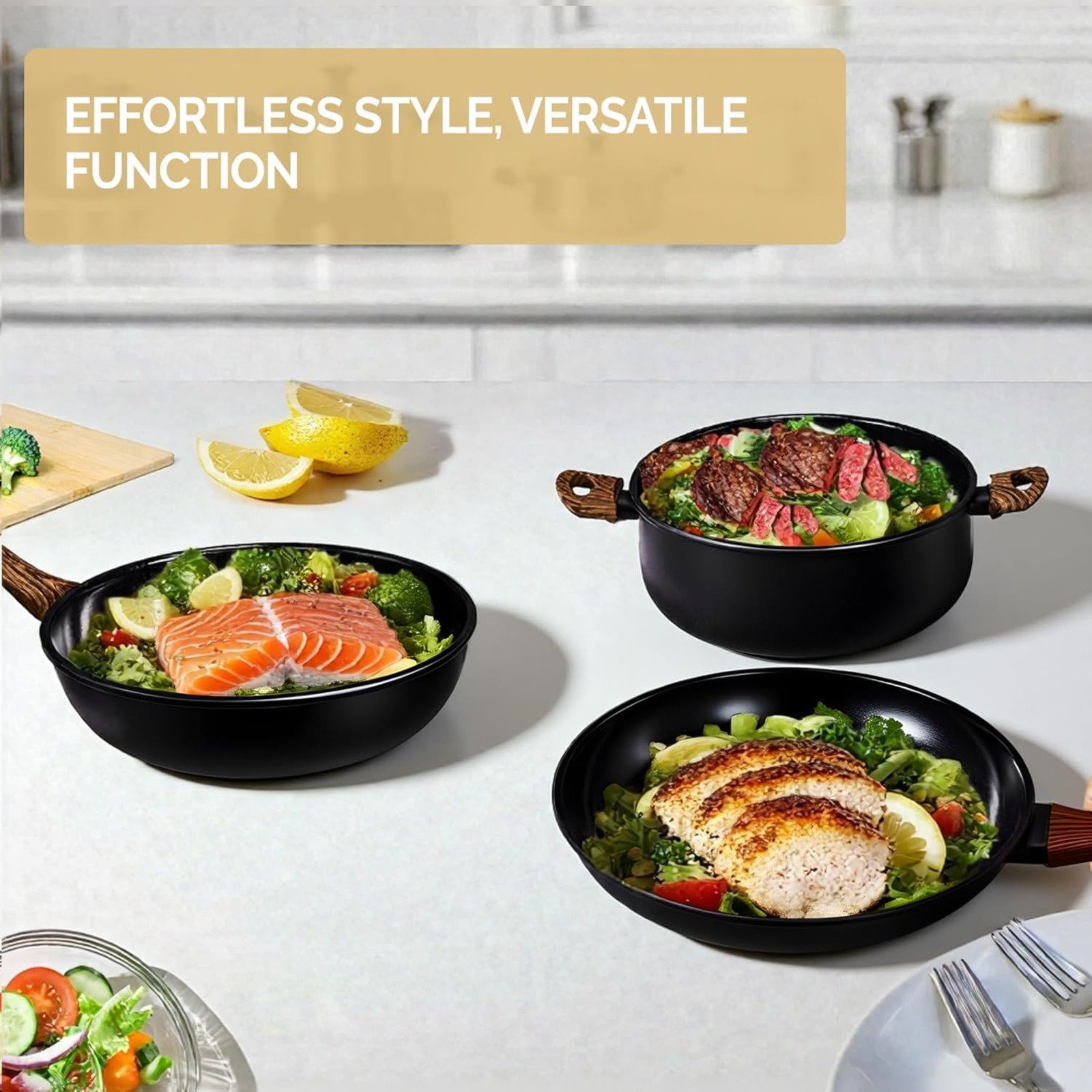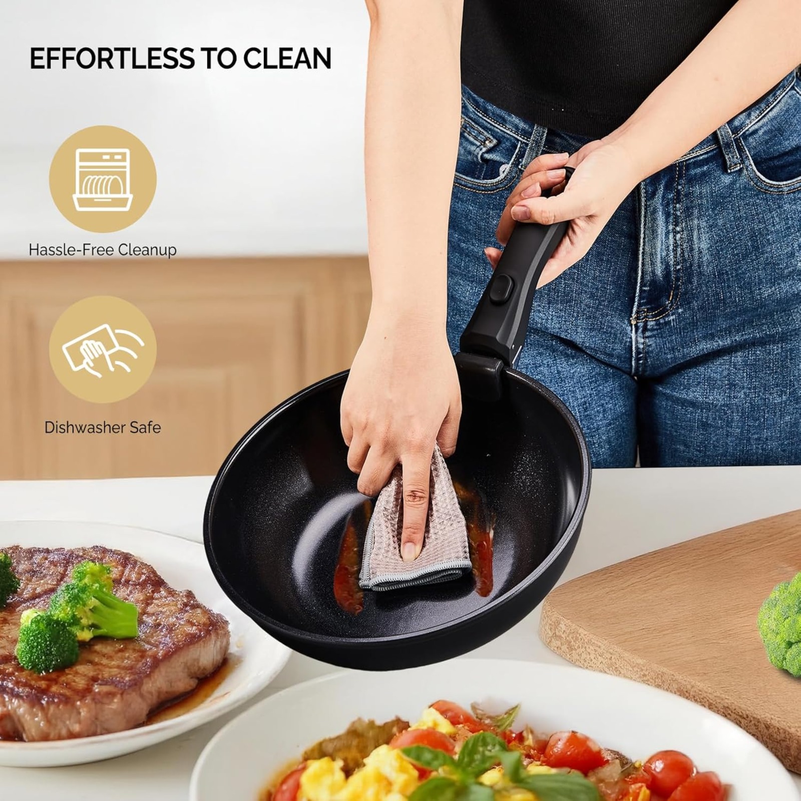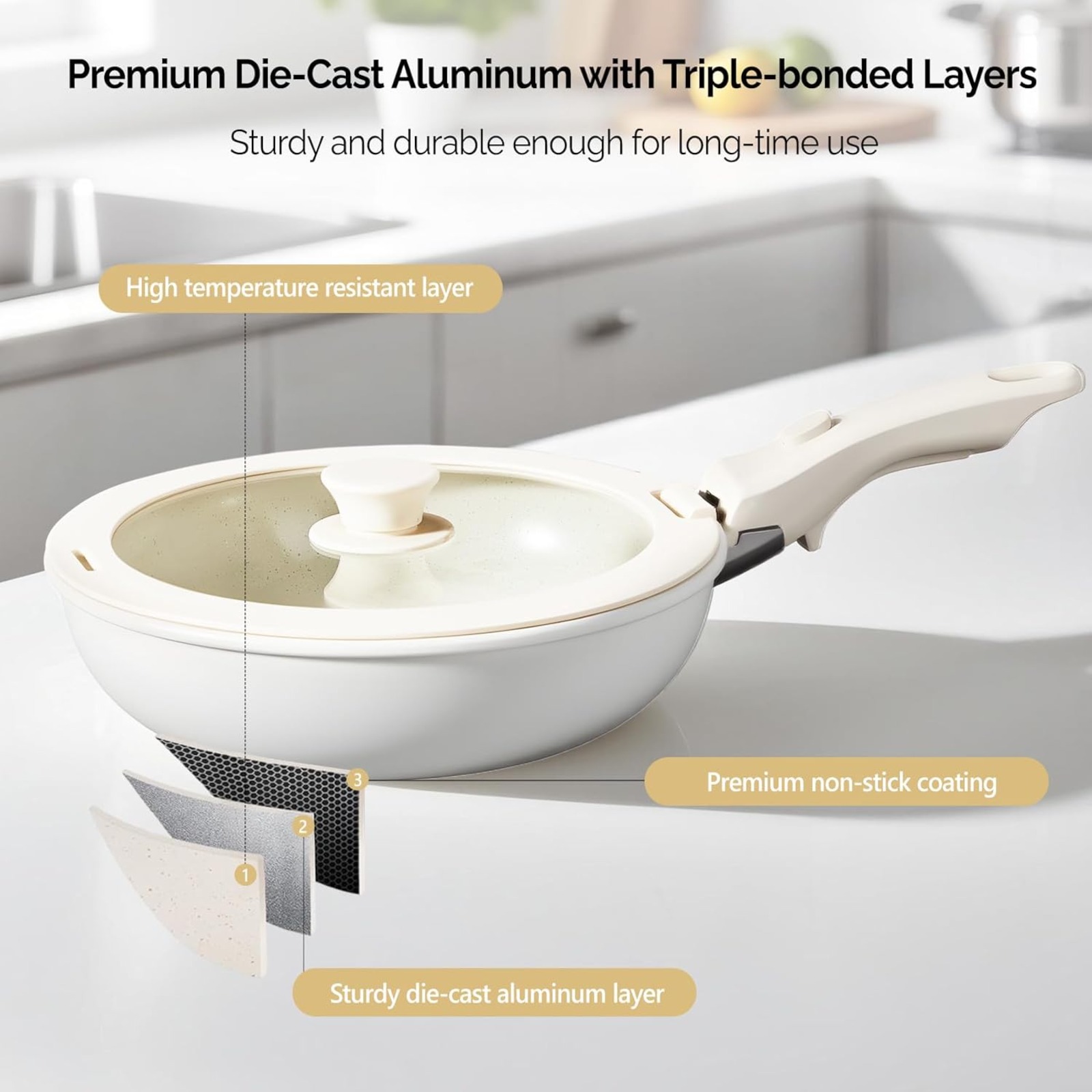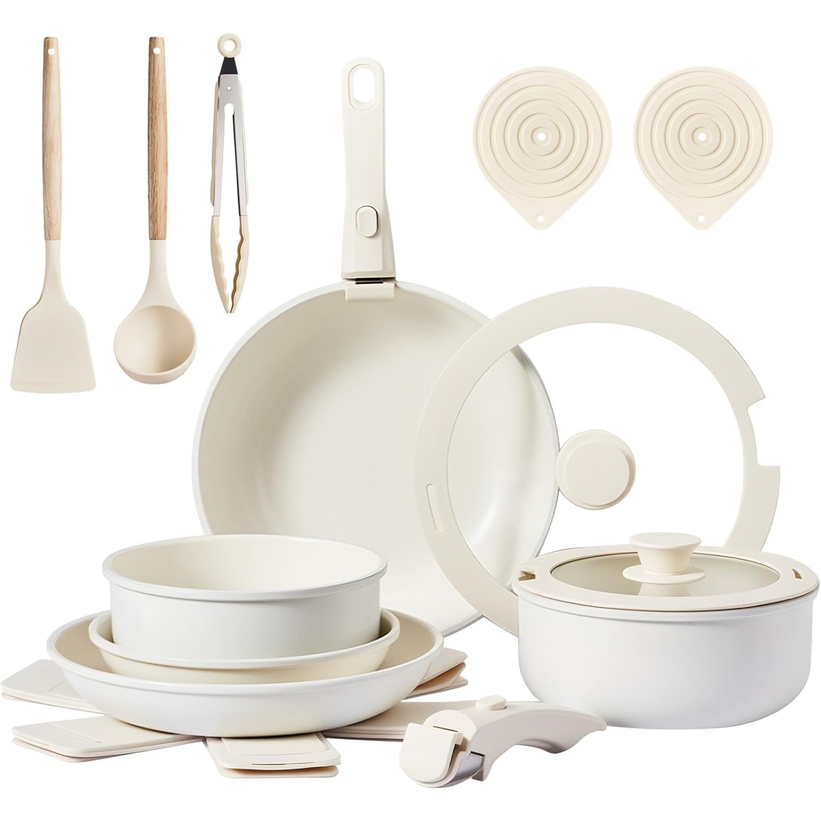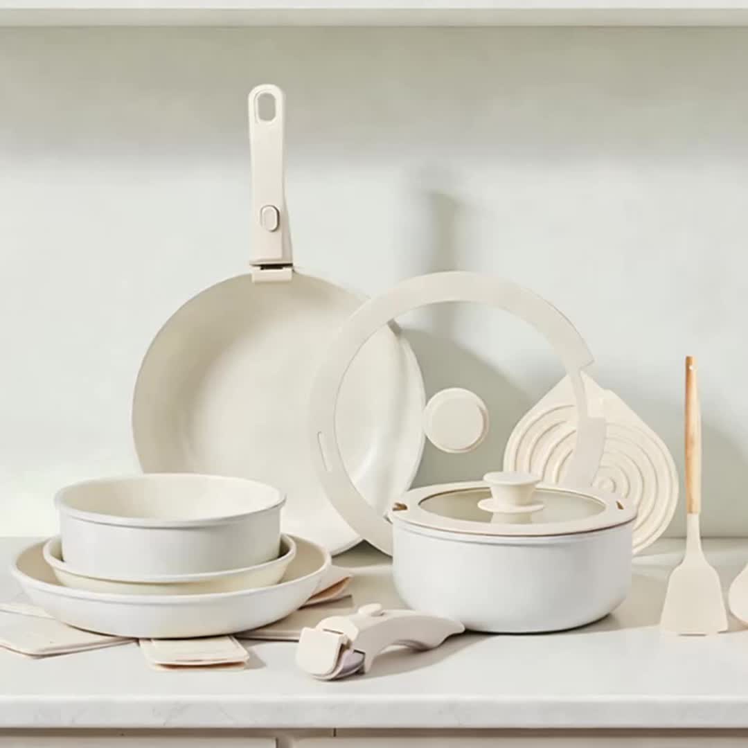 22 Pcs Nonstick Pots and Pans Set, Cast Aluminum Kitchen Cookware Set with Detachable Handles, RV Kitchen Cooking Set and Utensils, Dishwasher Safe, PFAS PFOA & PFOS Free, Cream White