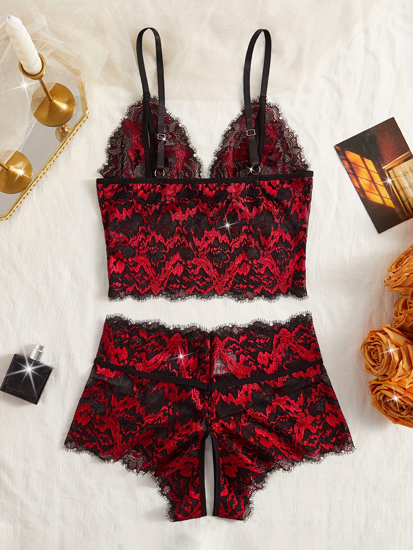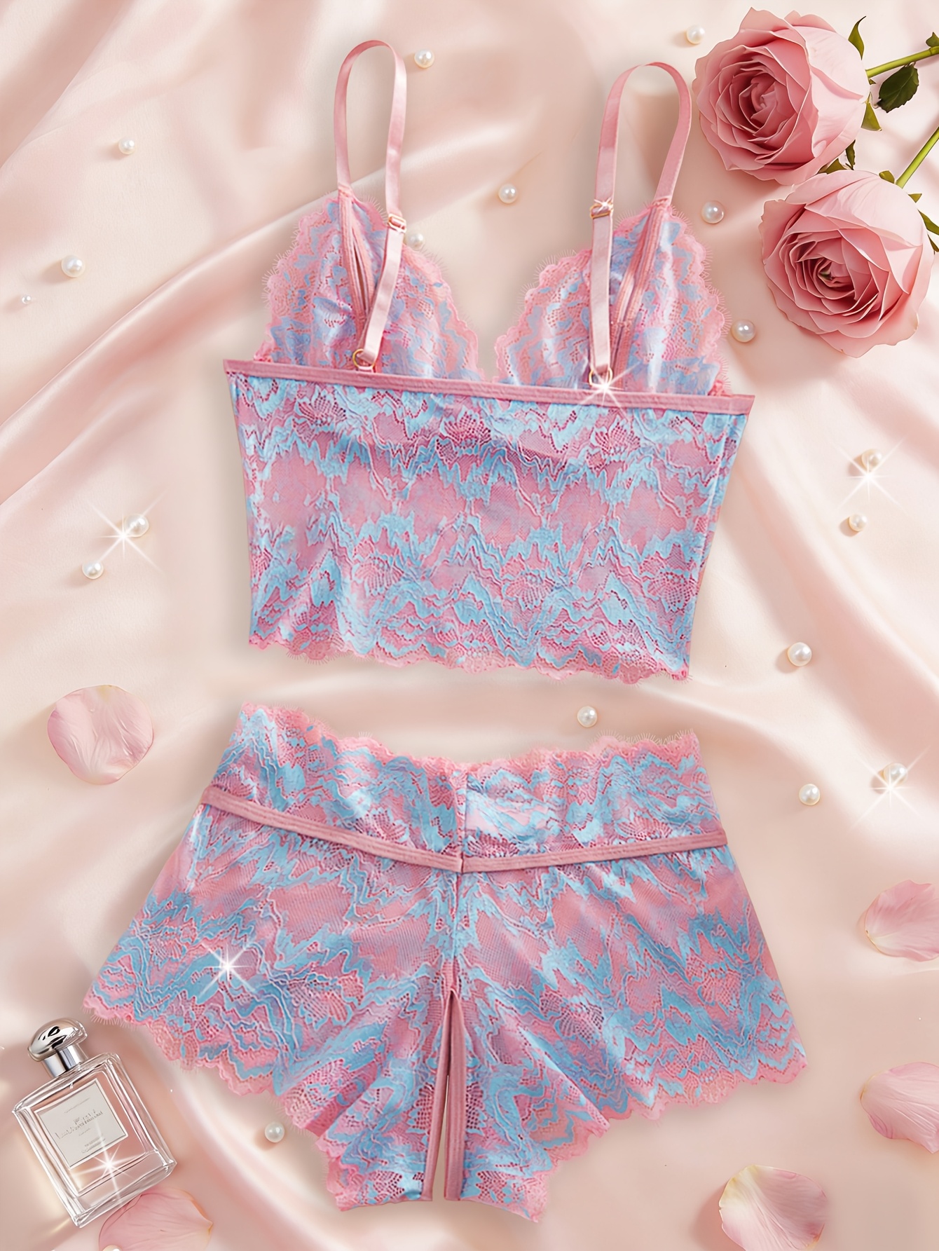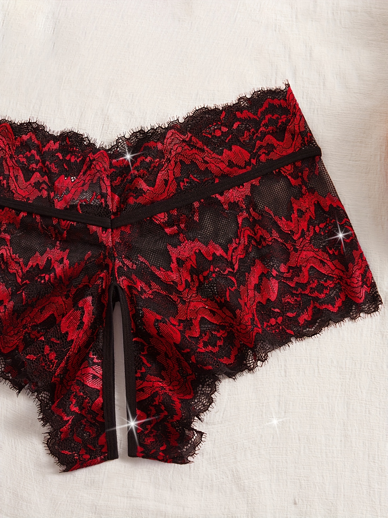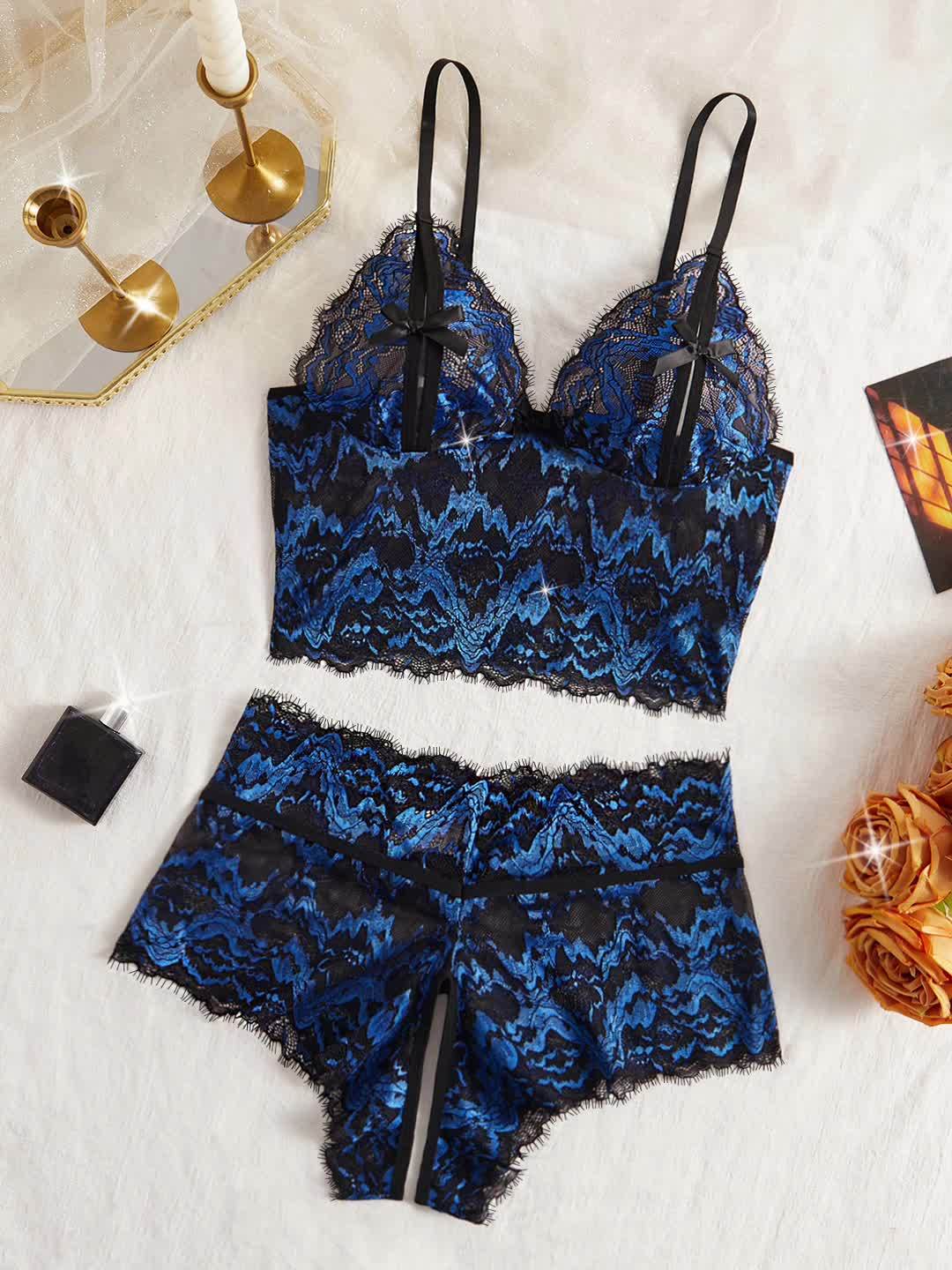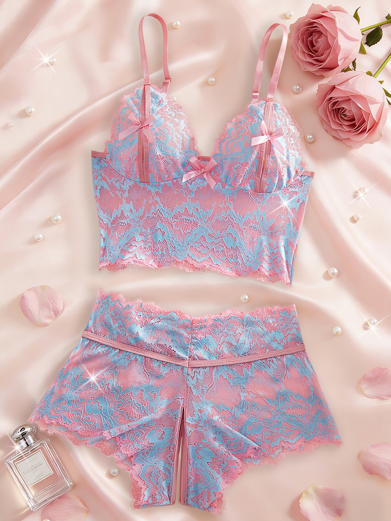 2pcs Color-Contrast Lace Pattern Sexy Lingerie Set | Hollow-out Bow Bra, Sexy Crotch-Opening Design Shorts, Women’S Charming Lingerie