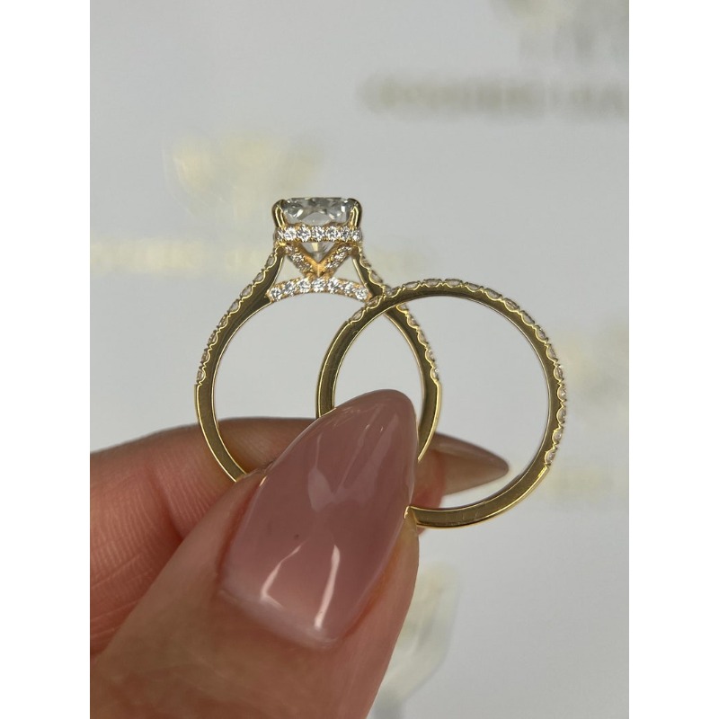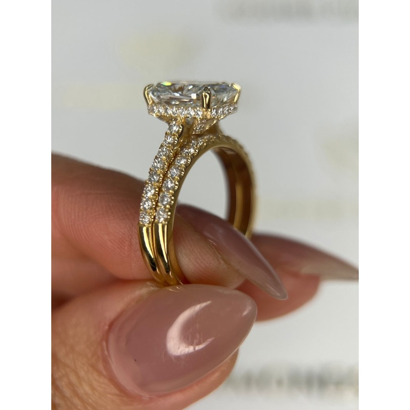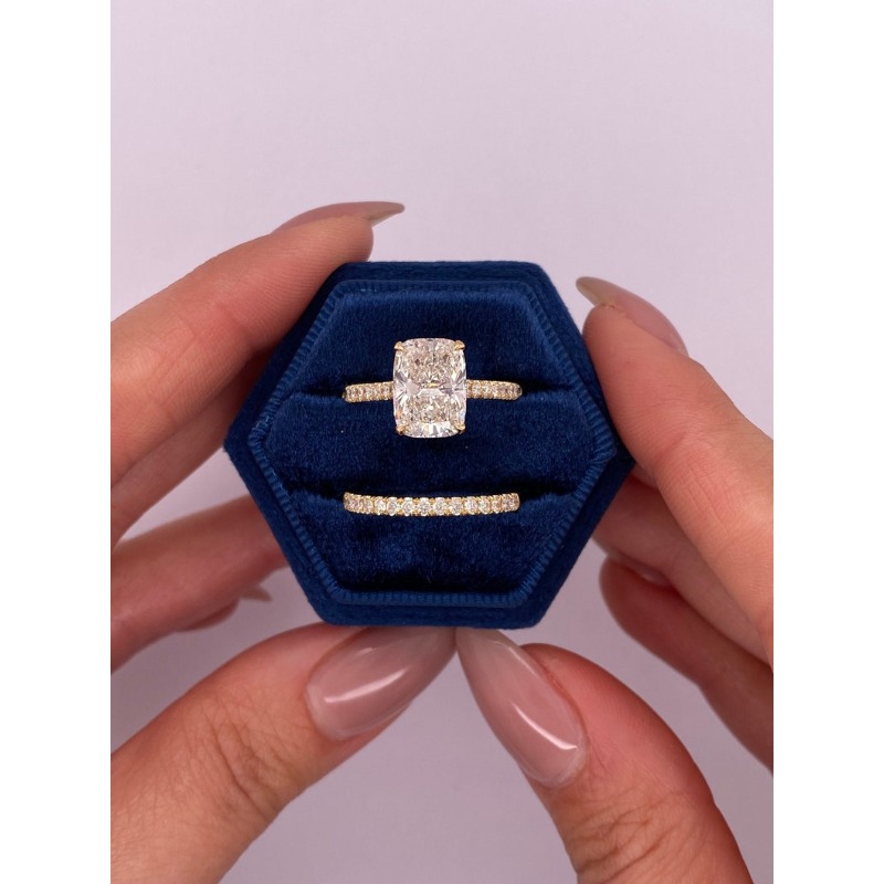A stunning 3.5 Carat Elongated Cushion Lab-Diamond Set, featuring an E Color VVS2 IGI Certified stone. With a secret Hidden Halo and a matching wedding band, this elegant set is the perfect Valentine’s Day or Engagement gift for a lifetime of ethical, high-clarity brilliance.