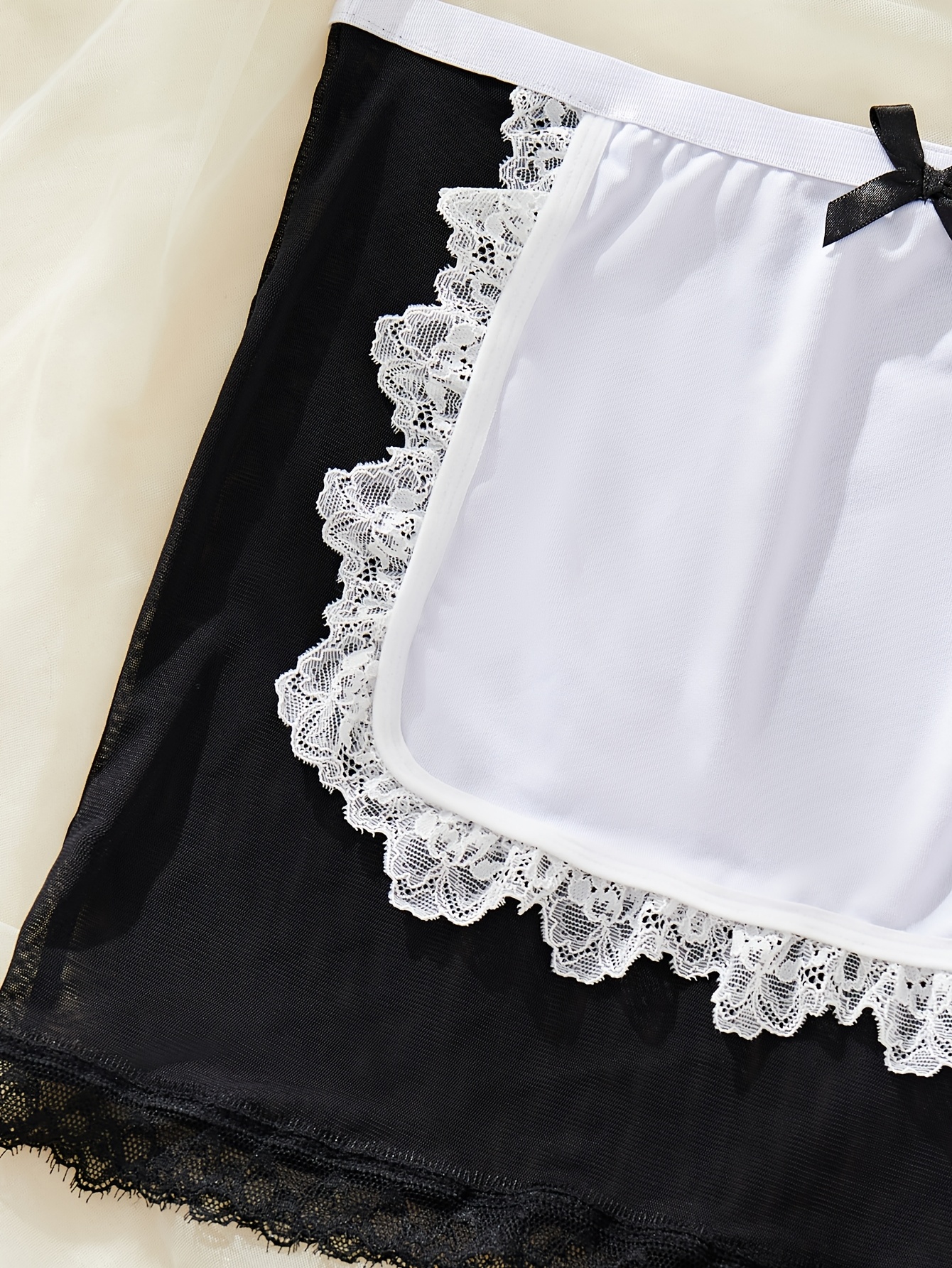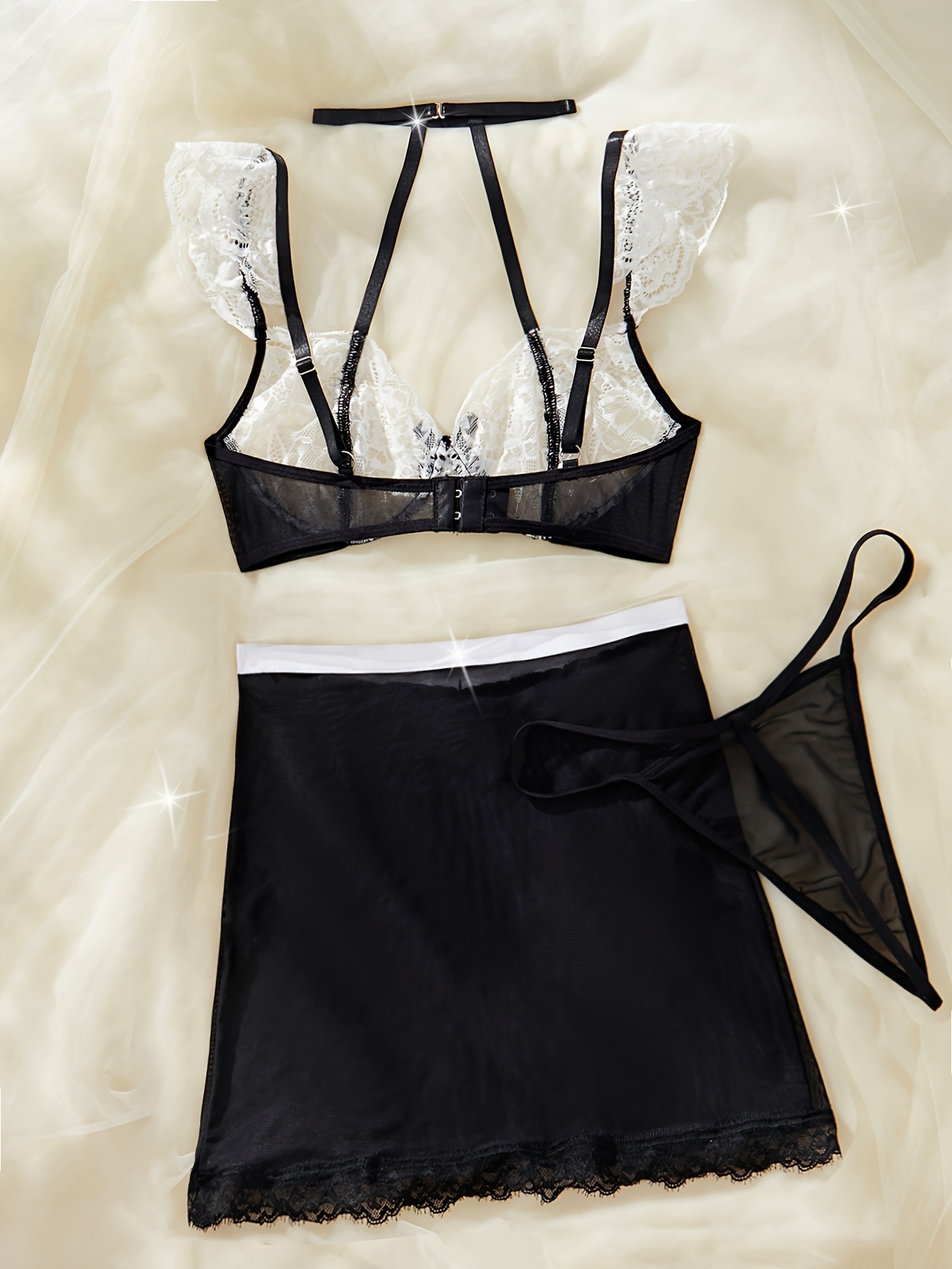 3pcs maid role-playing sexy costume Halloween, hollowed out lace bra, contrasting color transparent short skirt, sexy thong, Women’s Provocative sexy lingerie set