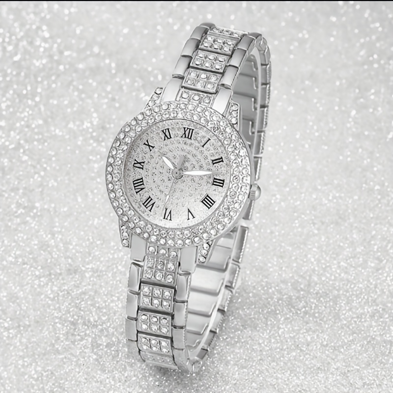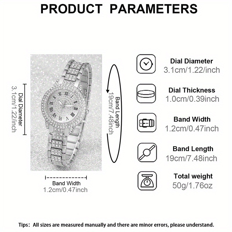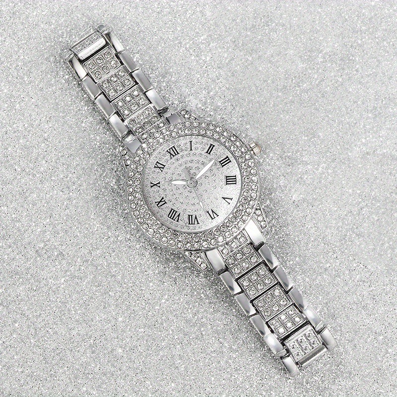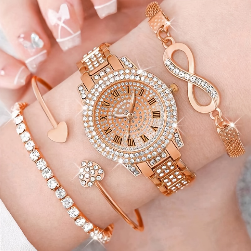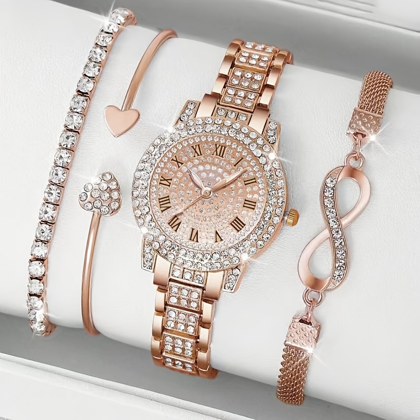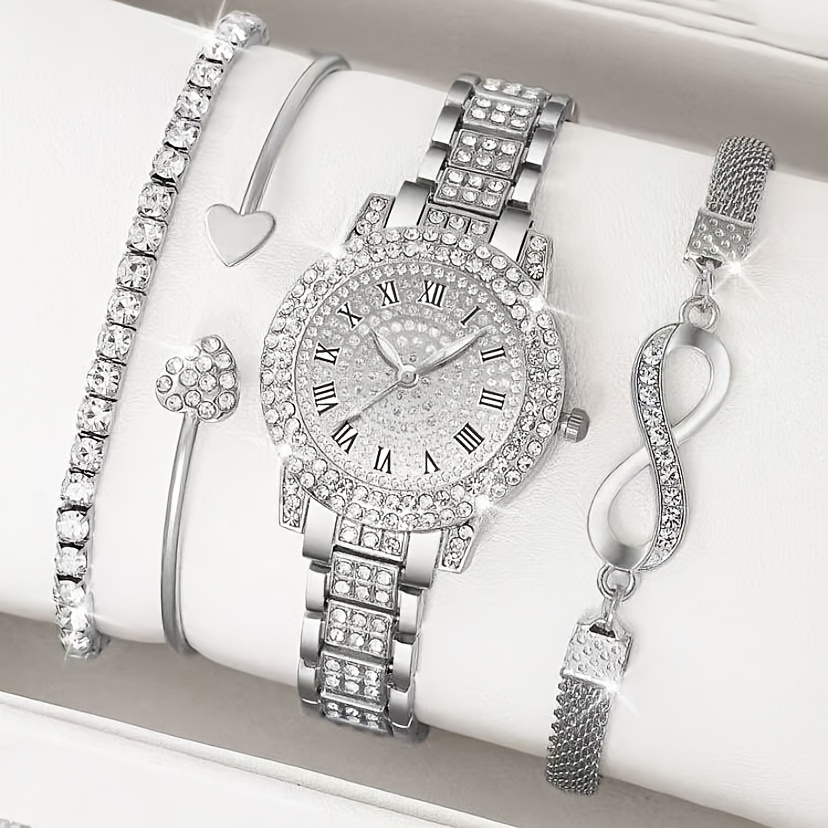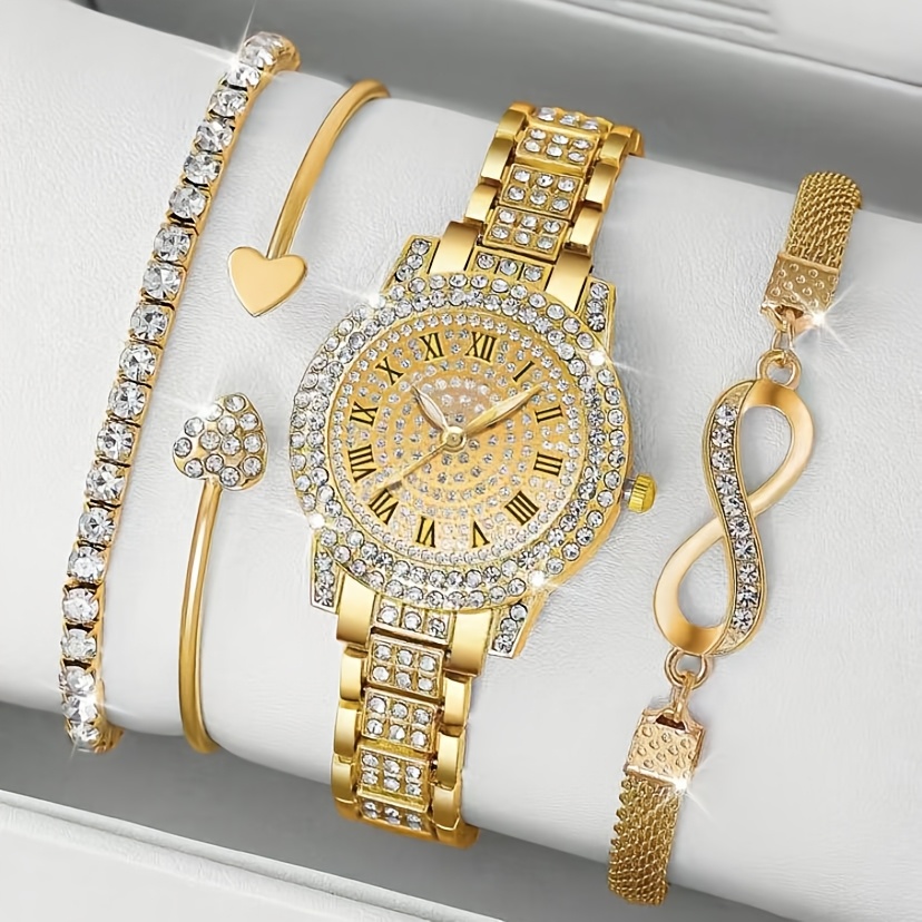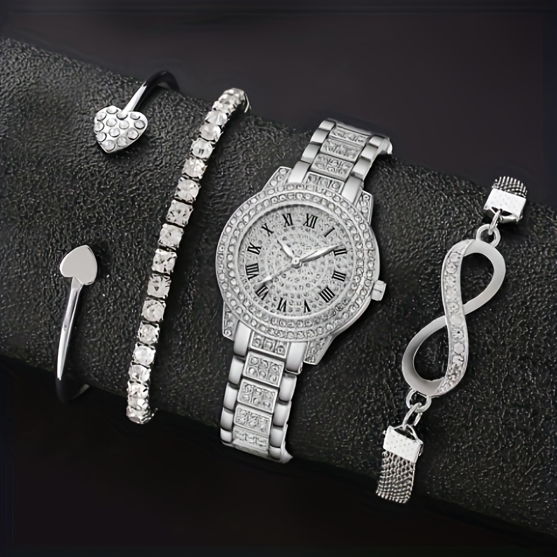 4pcs Elegant Women’s Watch & Bracelet Set with Rhinestone Roman Numeral Dial, Quartz Movement Wristwatches & Matching Alloy Bracelets – Luxury Sparkling Watch Collection for Wedding, Party, Everyday Gift