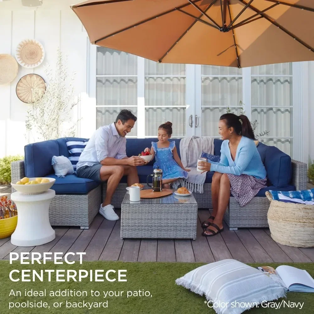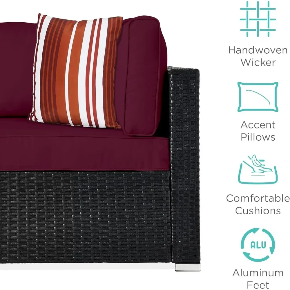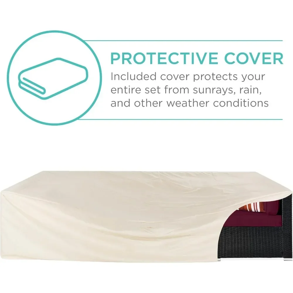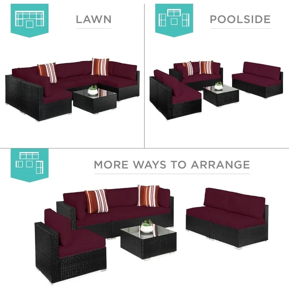 MODULAR WICKER SECTIONAL: Customize to match your patio or deck and change it whenever you want! The set includes 4 single chairs, 2 corner chairs, 1 table with a tempered glass top, cushions, 2 accent pillows, protective cover, and seat fastener clips
