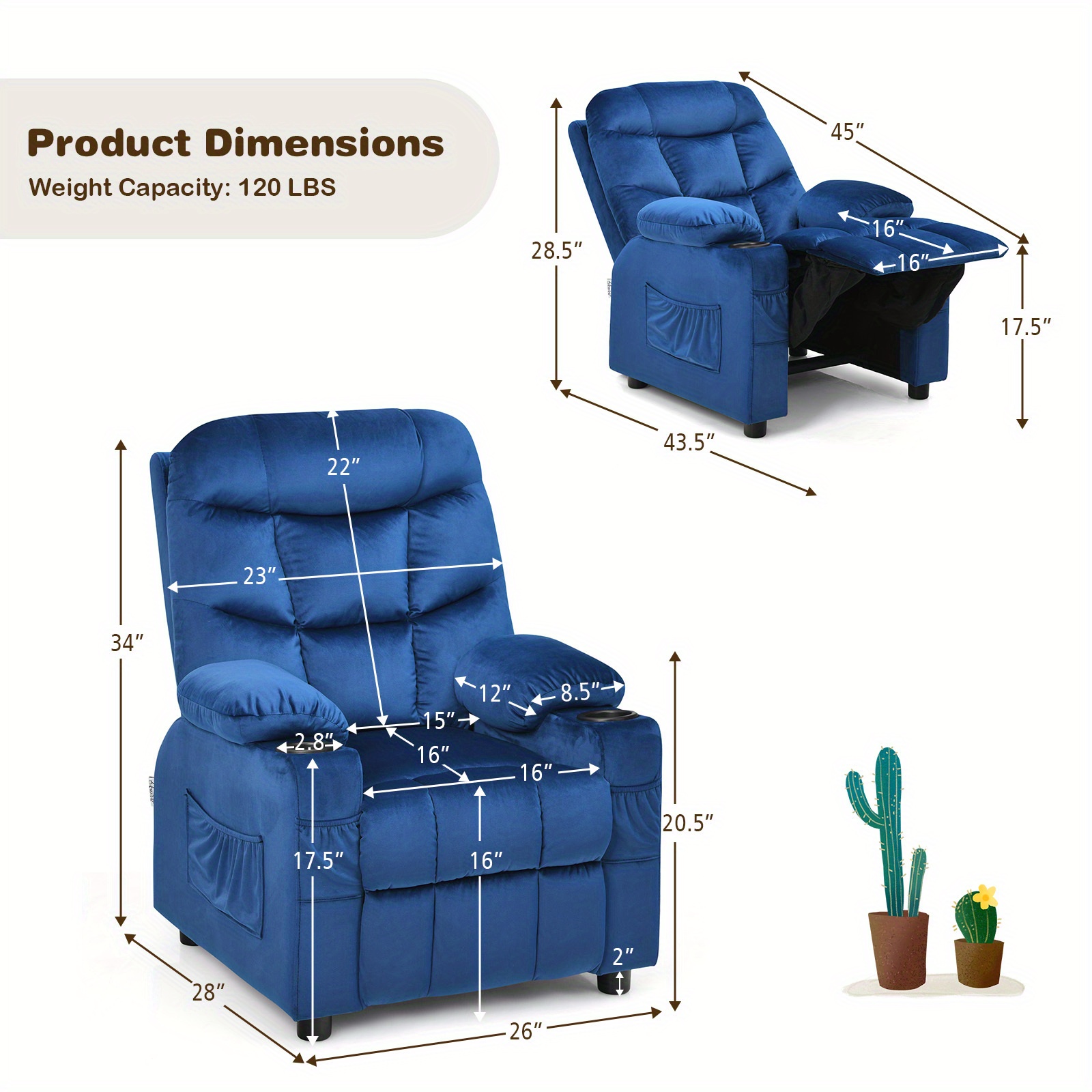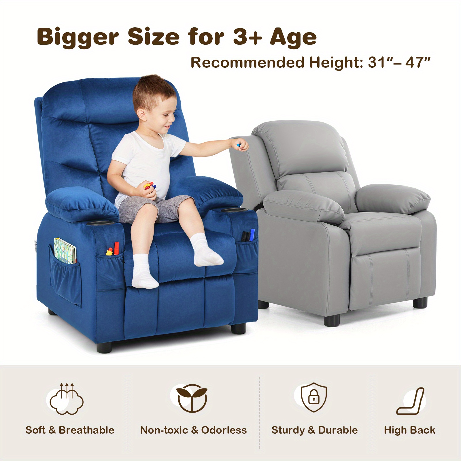 COSTWAY Classic Hardwood Kids Recliner Chair, Adjustable Velvet Lounge with Cup Holders, Side & Front Pockets, Footrest, Hand Washable, Ideal for Boys’ Living Room – No Electricity Needed