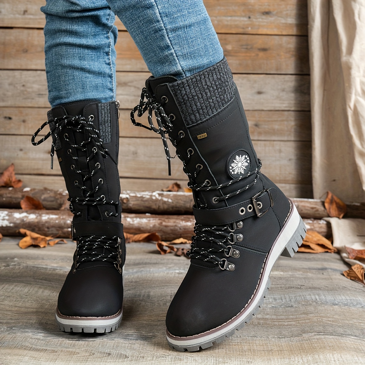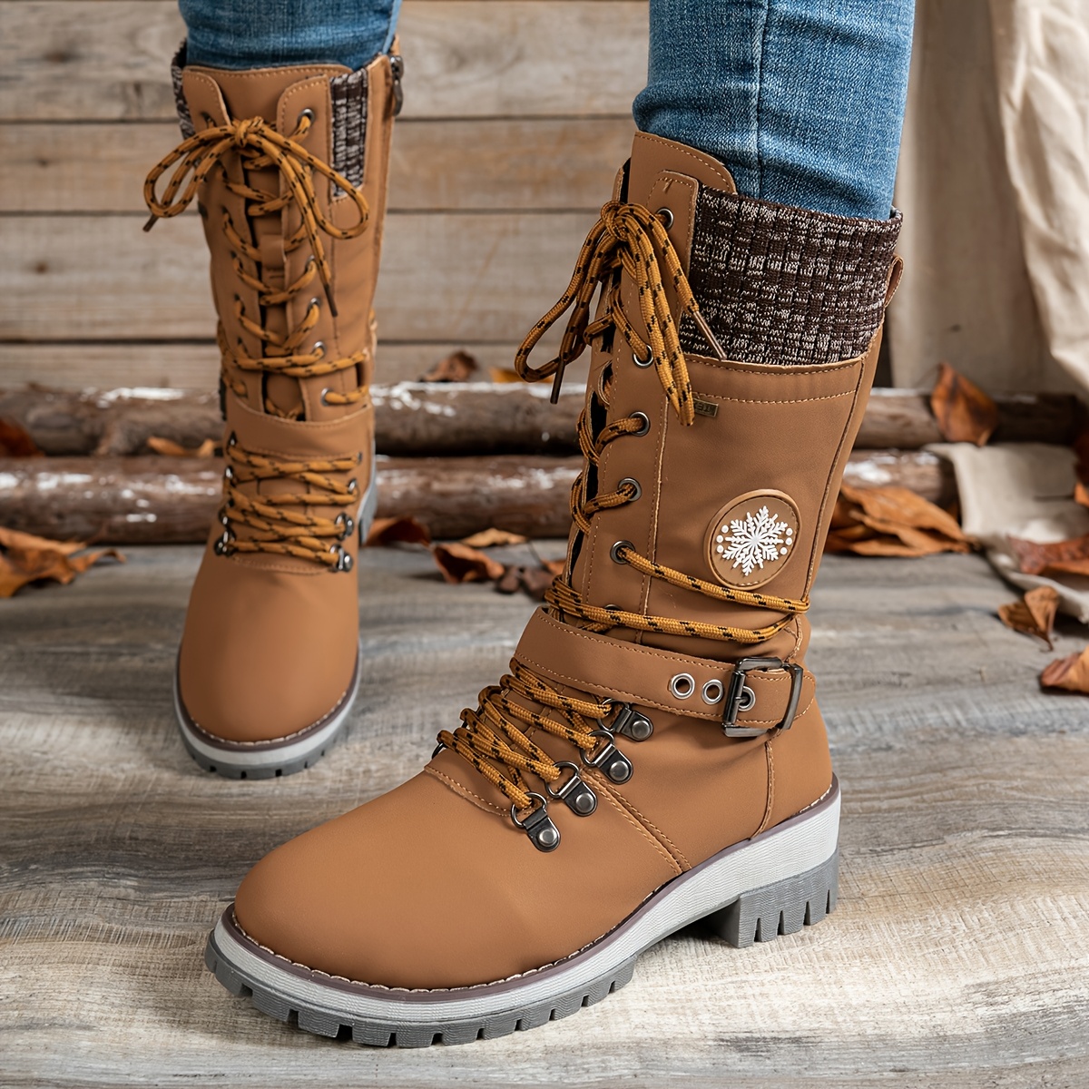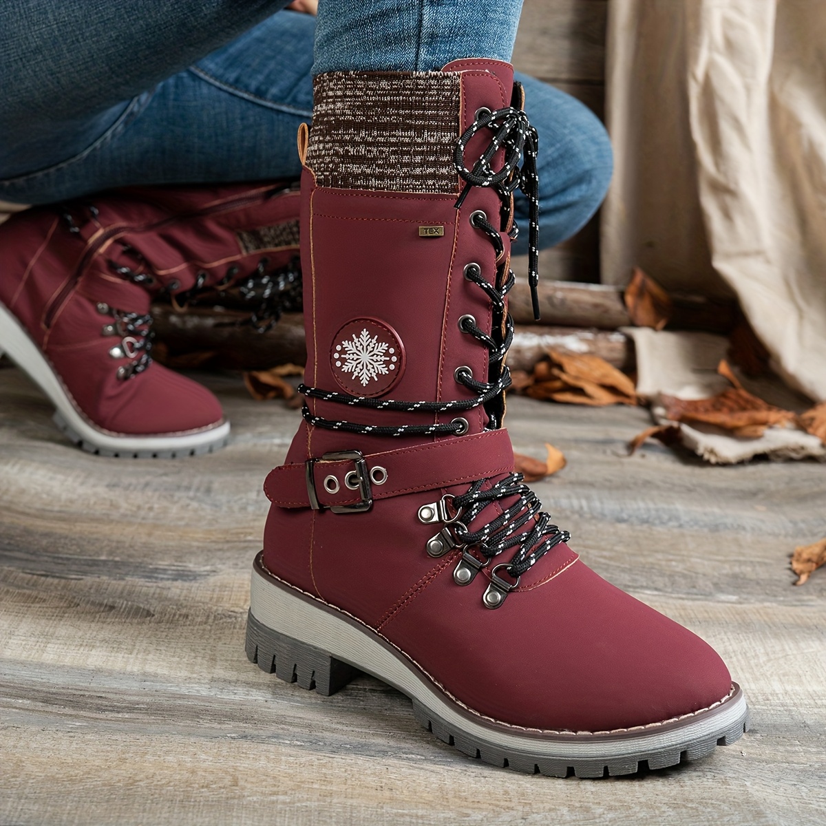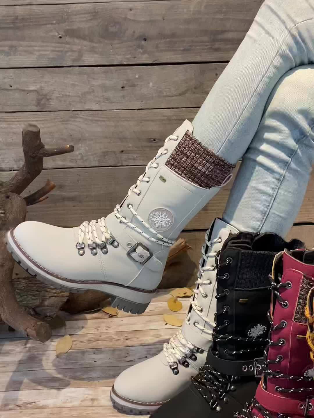 Cozy Mid-Calf Winter Boots for Women Featuring a Stylish Knit Trim, Anti-Slip Side Zipper, And Lace Design. They Have a Thick TPR Sole And Plush Inner Lining, Available in Vintage Black, Brown, Beige, Red, And White, Perfect for Casual Outings.