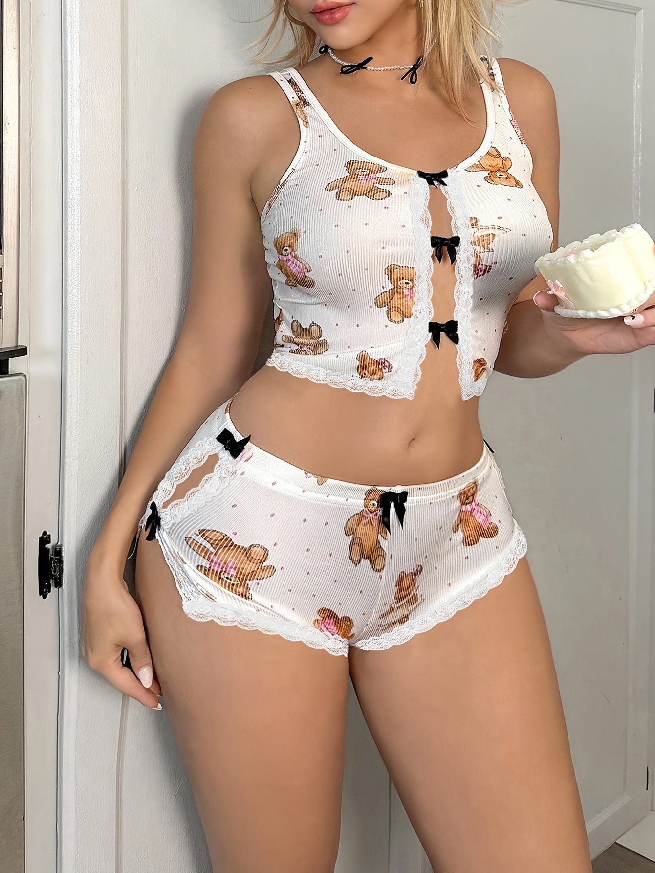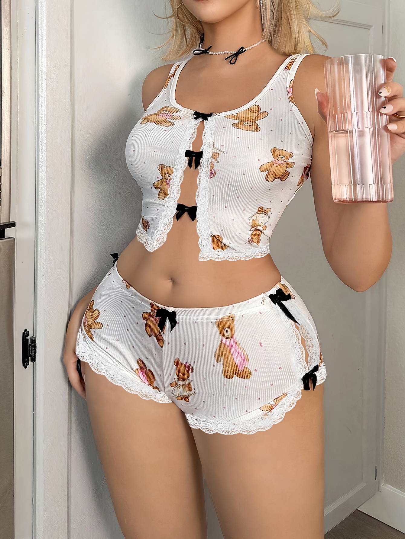 Elegant Women’S Home Bear Print Bowknot Decorative Vest and Shorts Set – Soft White with Black Trim, All-Season Comfort, Adult Pajama Set, Comfortable Loungewear|Playful Print Design|Soft Fabric