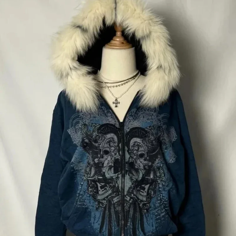 Gothic Harajuku skull letter embroidery slim vintage zip up hoodies for women subculture y2k winter new dark casual sweatshirts