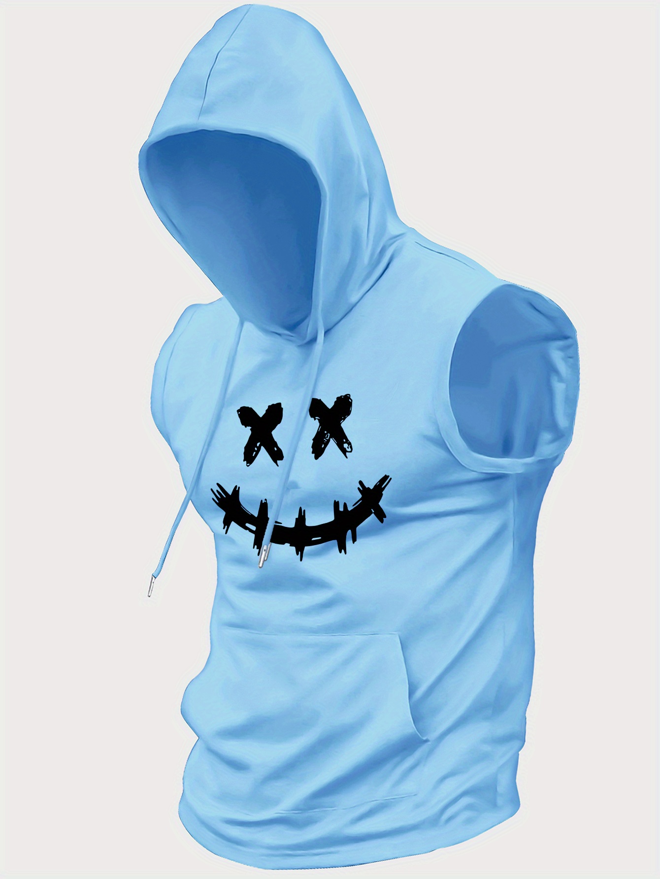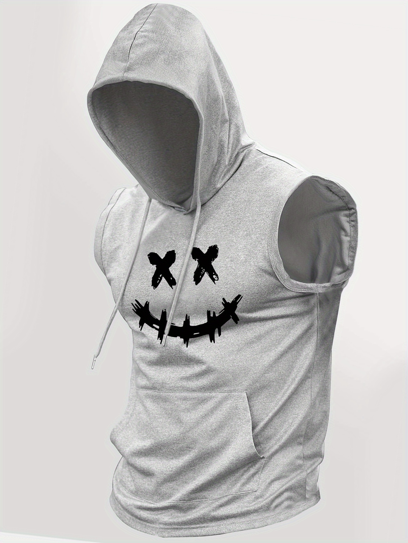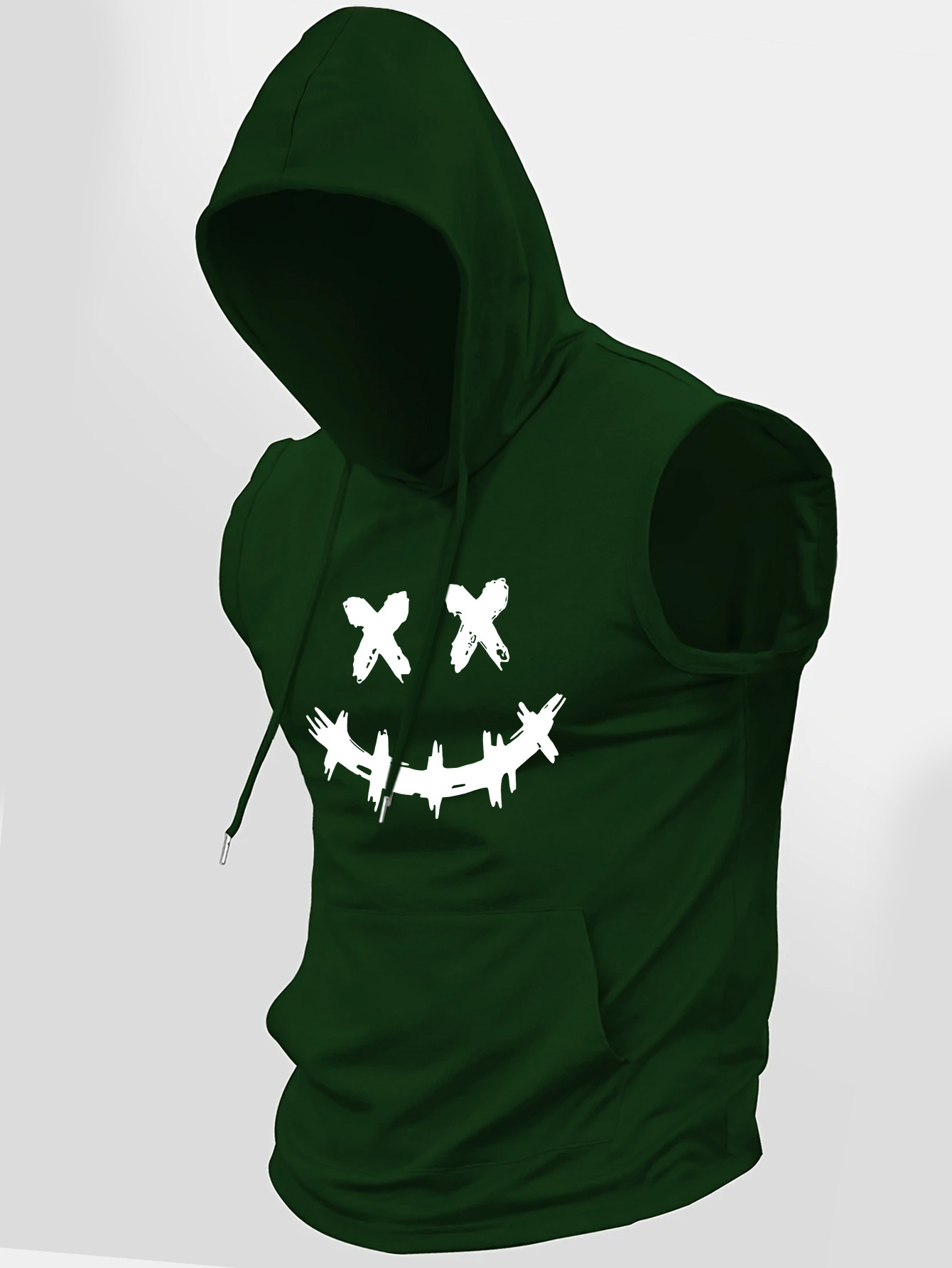 Men’s Black Horror Icon Hooded Vest – Summer Sleeveless Jacket with Iconic White X-Eyes & Stitched Smile, Gothic Grim Reaper Costume Accessory, Casual Dark Theme Outfit for Halloween Parties & Outdoor Activities