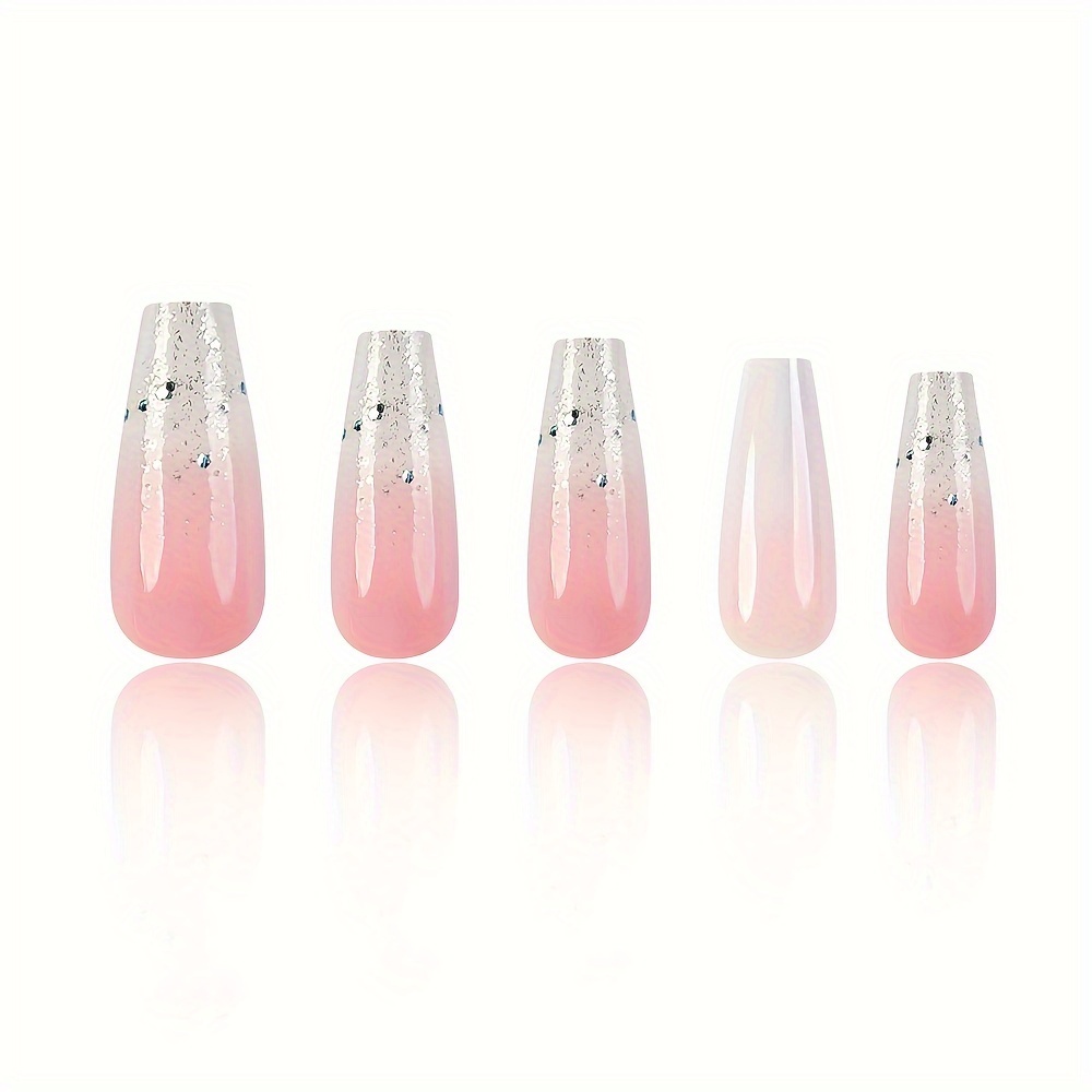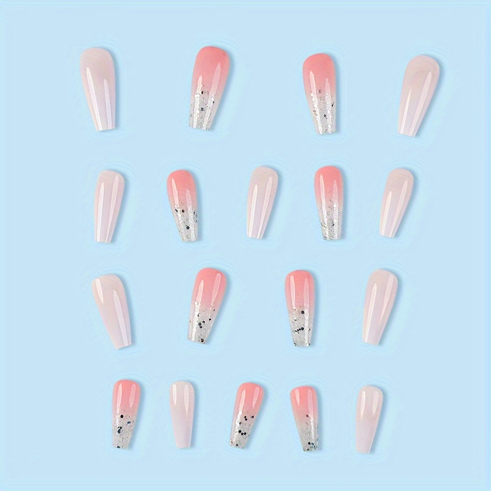 A salon-grade 24-Piece Long Coffin Press-On Nail Set featuring a breathtaking pink fashion gradient. Infused with a delicate shimmer and fine-milled glitter, these elongated ballerina-style nails offer a seamless ombre transition and a high-gloss finish for a look that is both glamorous and durable.