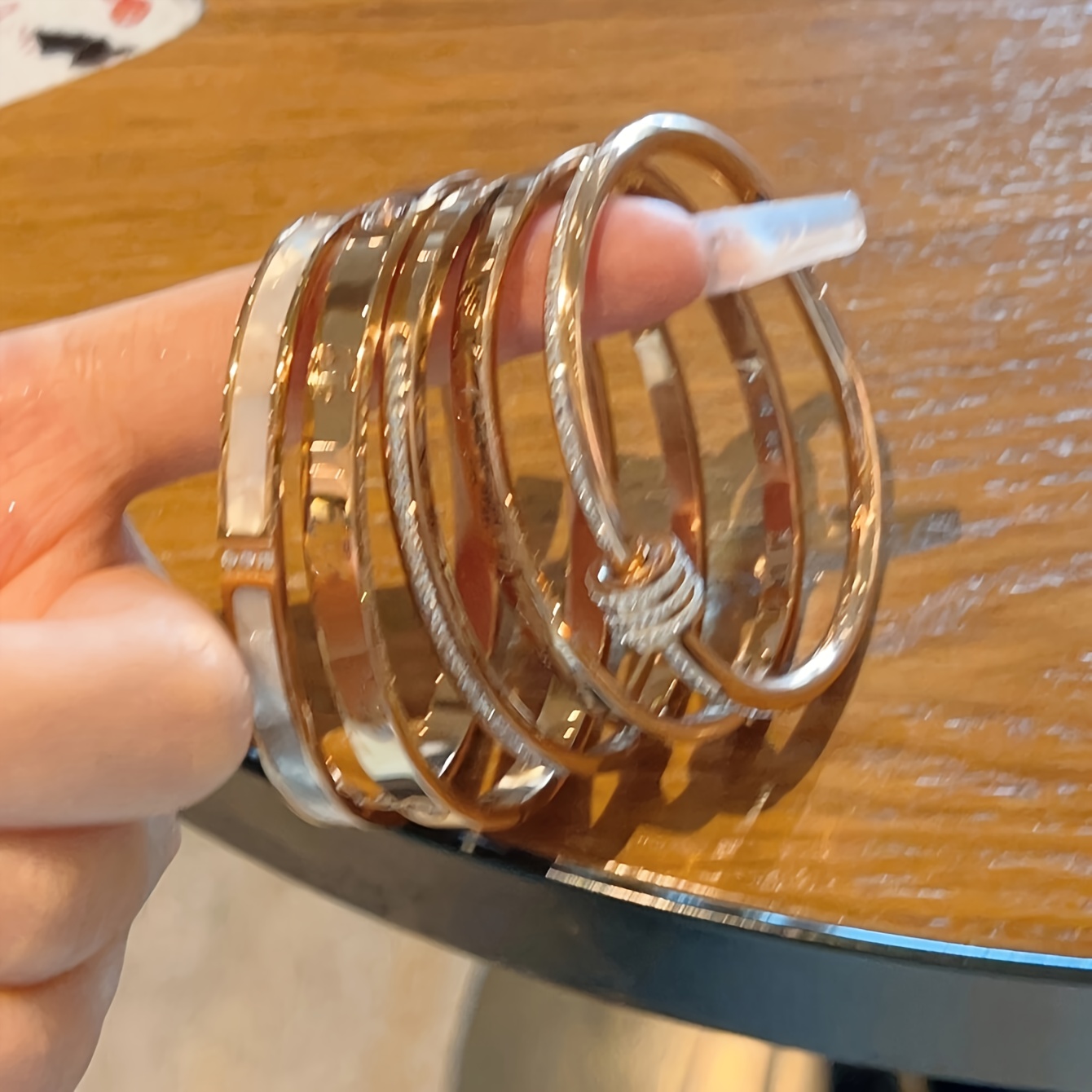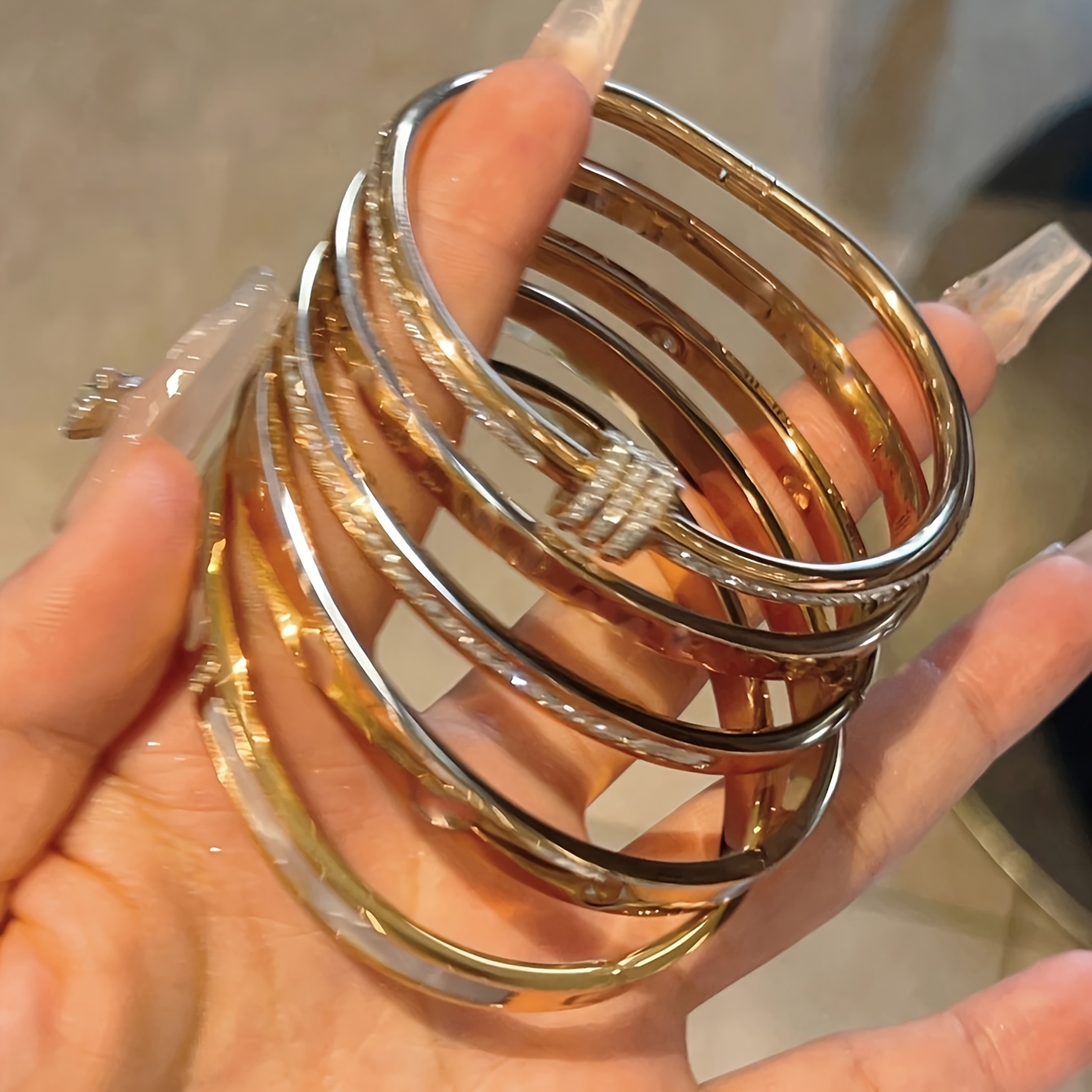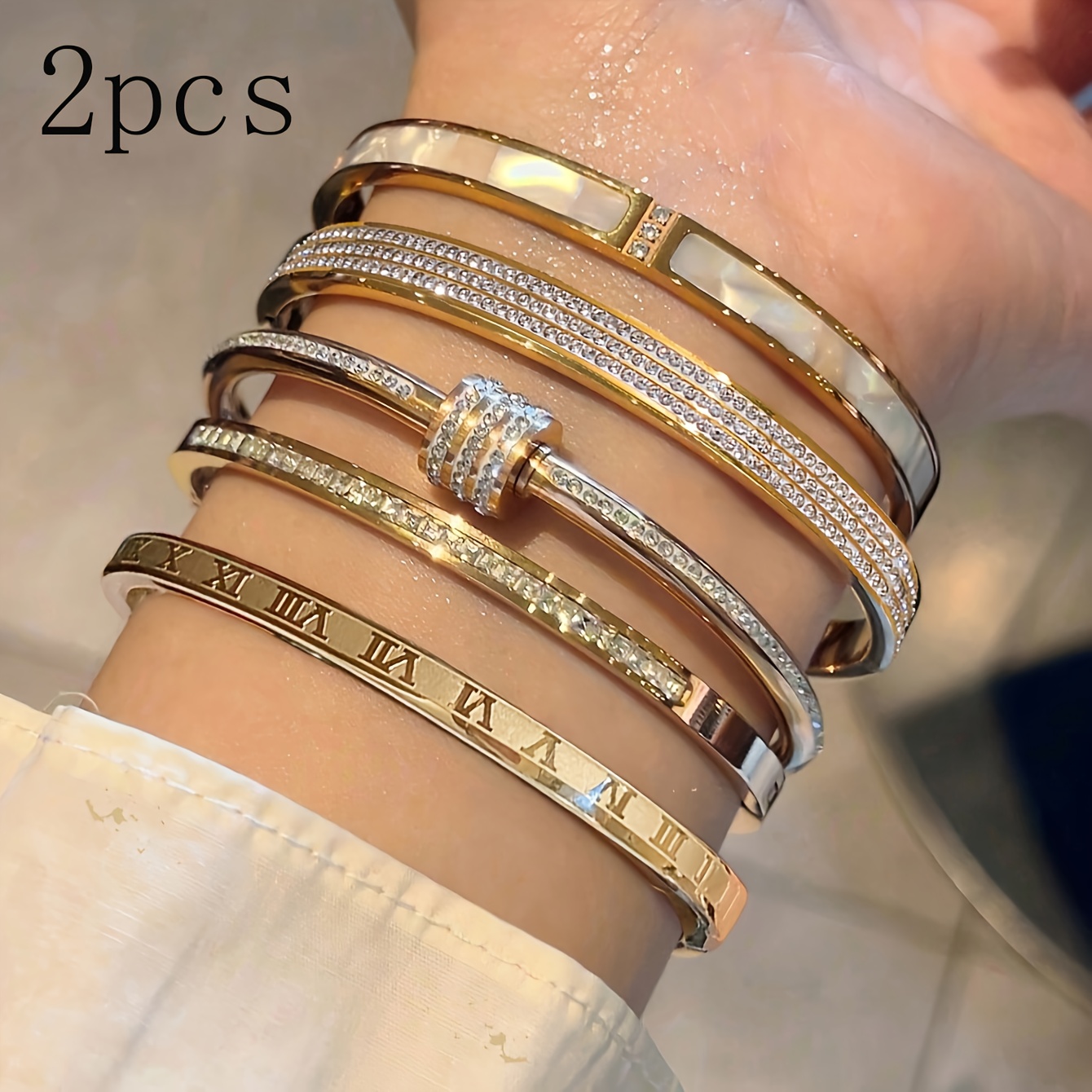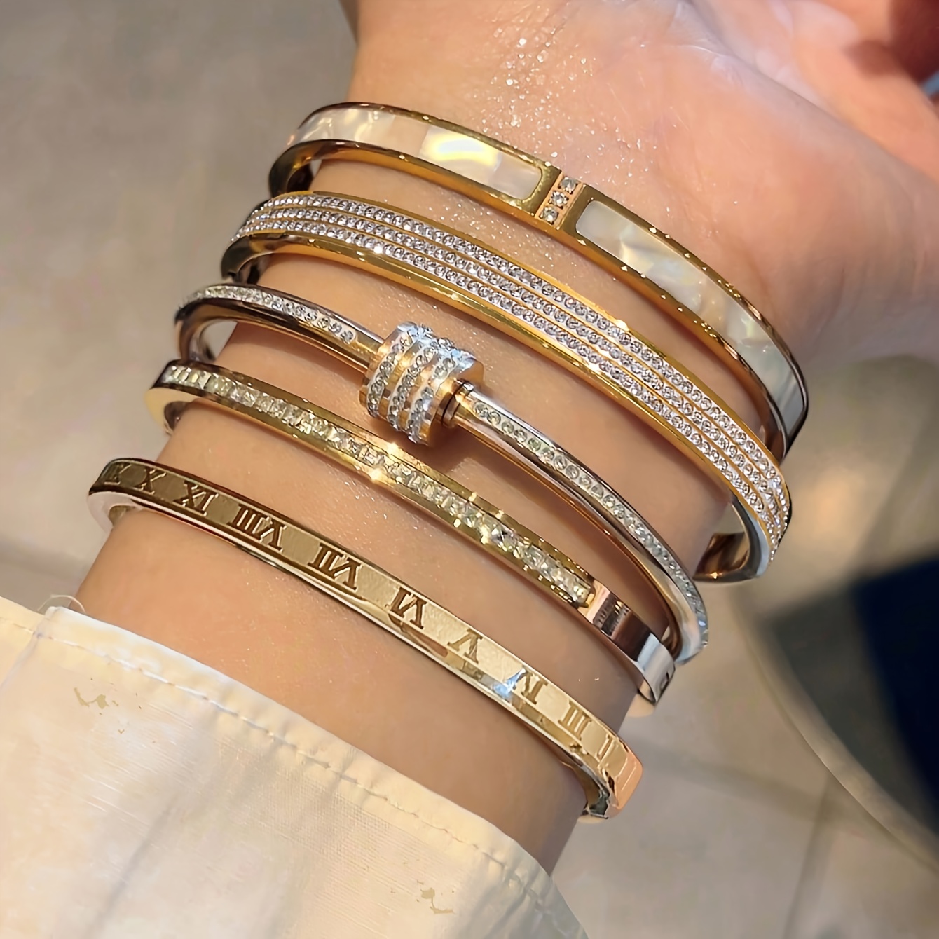 “There is a satisfying ‘clink’ and a comfortable weight that comes with high-quality steel jewelry—it feels substantial and expensive on the wrist. When you slide these on, the first thing you notice is the warmth of the golden finish; it has that rich, buttery glow usually reserved for 18k gold. The rhinestones provide a subtle but constant shimmer that elevates even a basic white T-shirt and jeans into a ‘look.’ Because the color doesn’t fade, you lose that anxiety about getting caught in the rain or forgetting to take them off before a workout. They become a part of your daily armor—pieces that you trust to stay looking brand new while you’re out making an impression.”