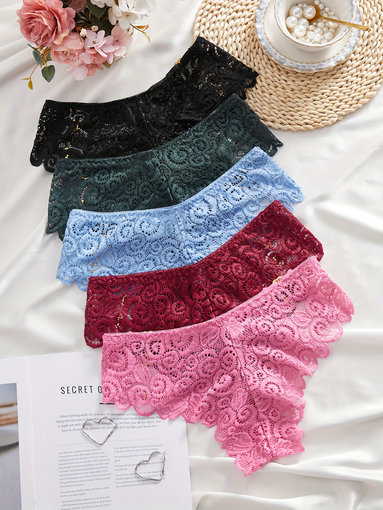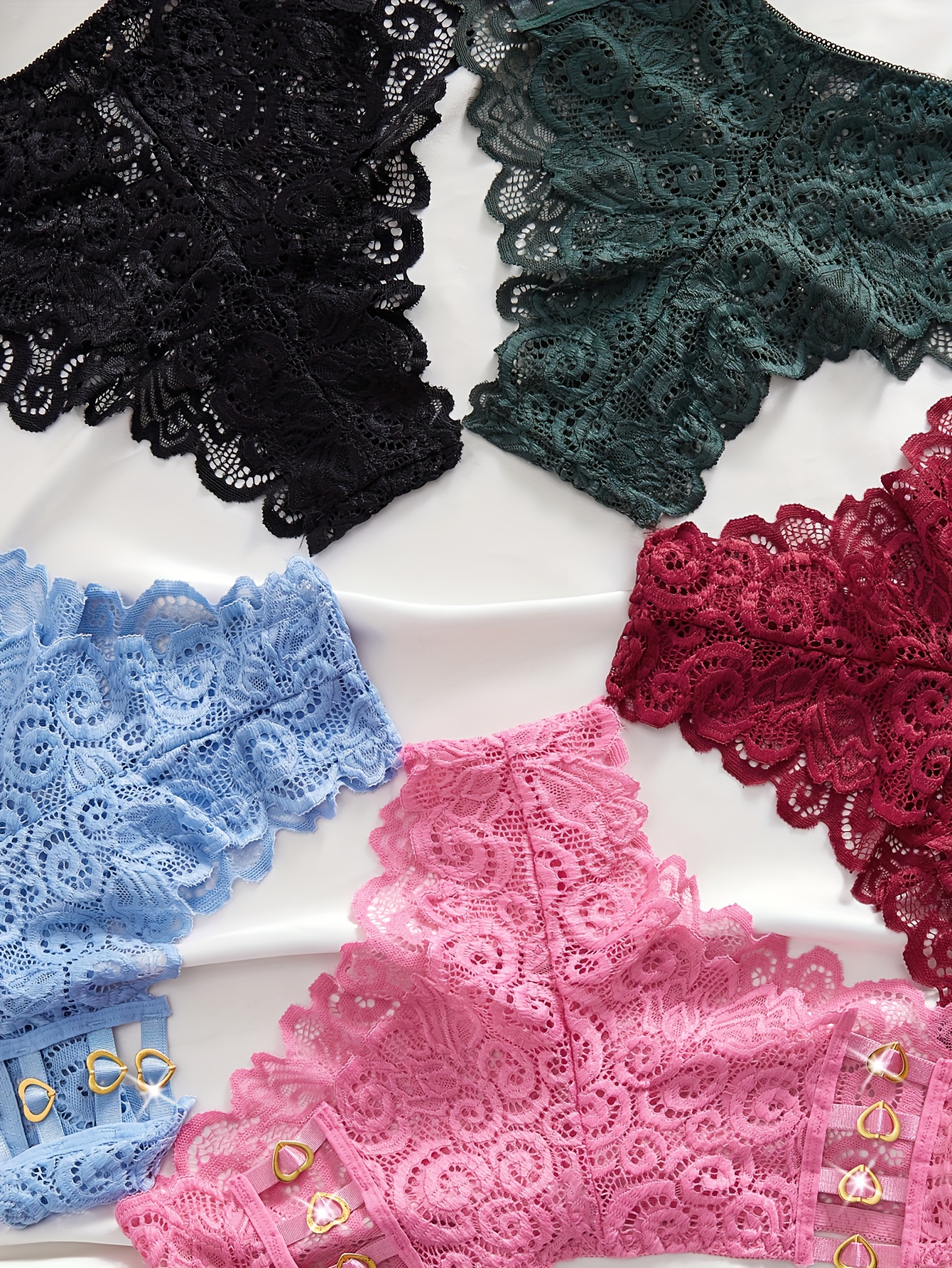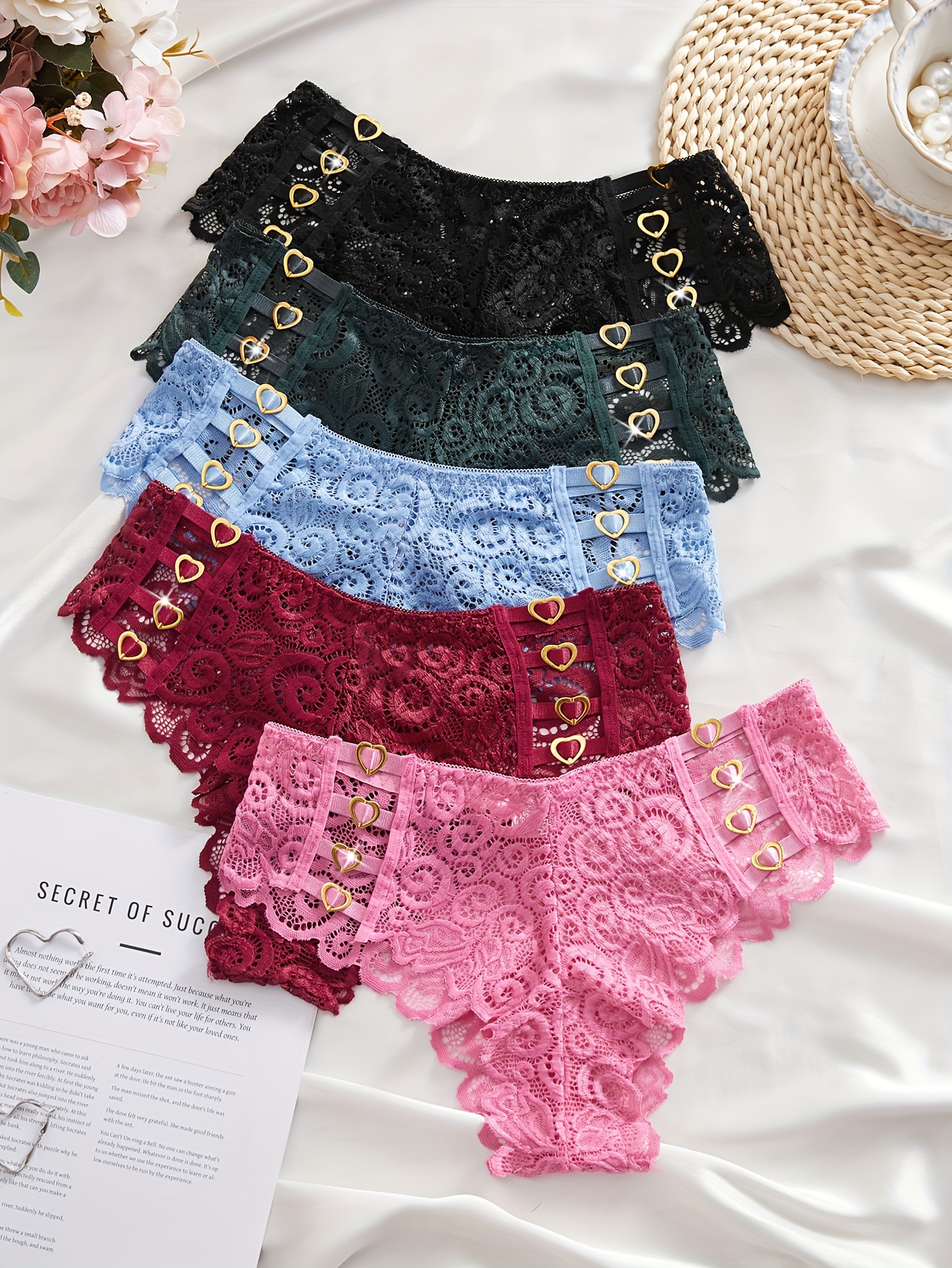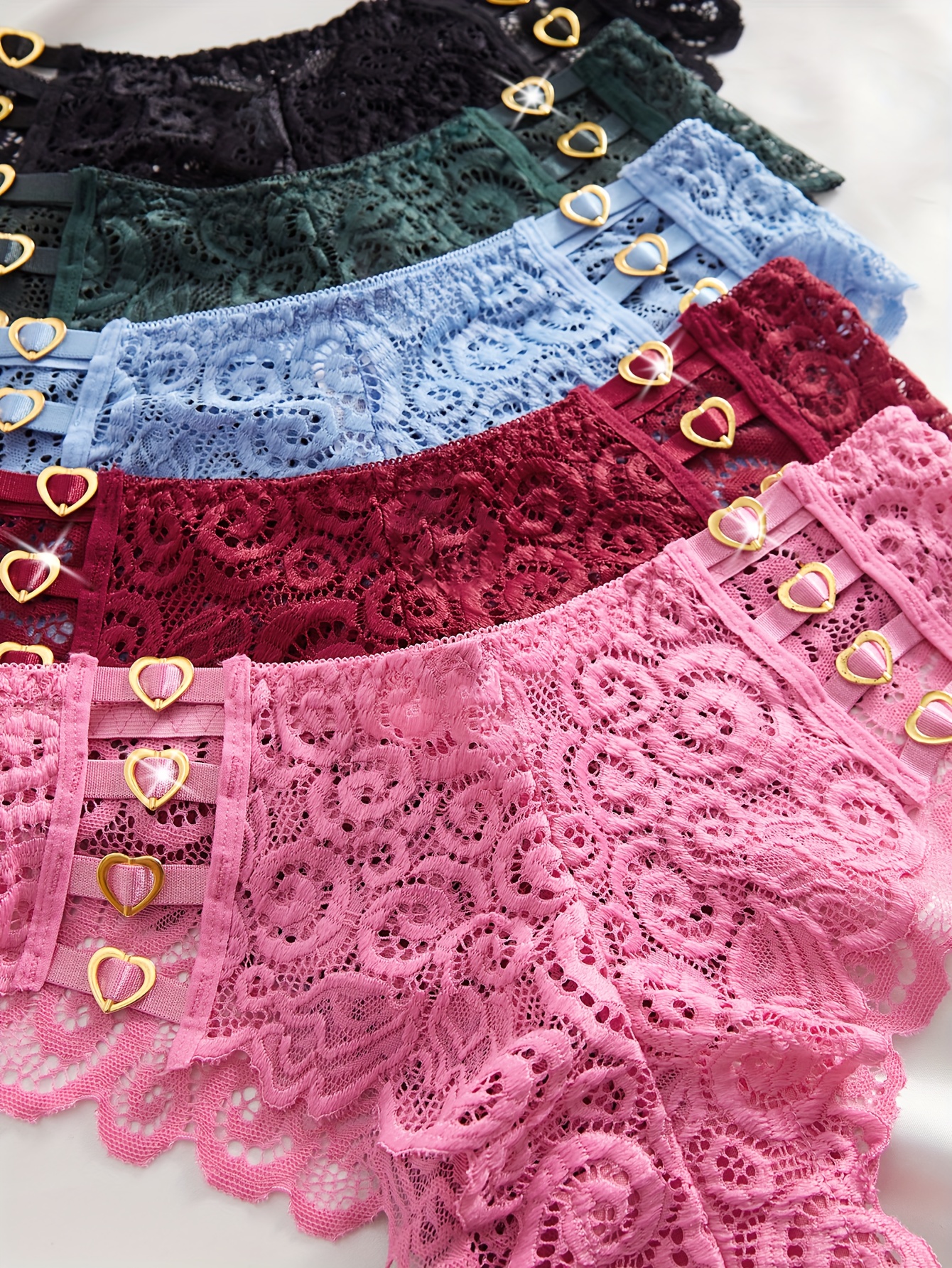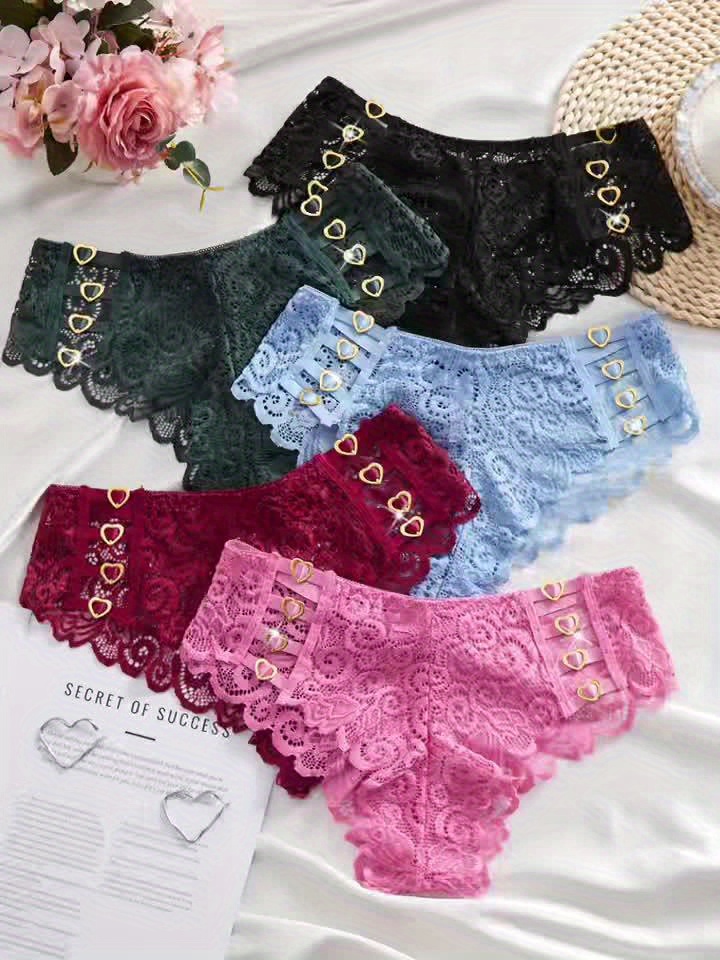 Set of 5 Women’S Panties Featuring Valentine’S Heart Designs, Made from Stretchy And Breathable Material. Available in Black, Green, Red, And Blue, Perfect As Christmas Gifts for Women Or Girlfriends for Valentine’S Day