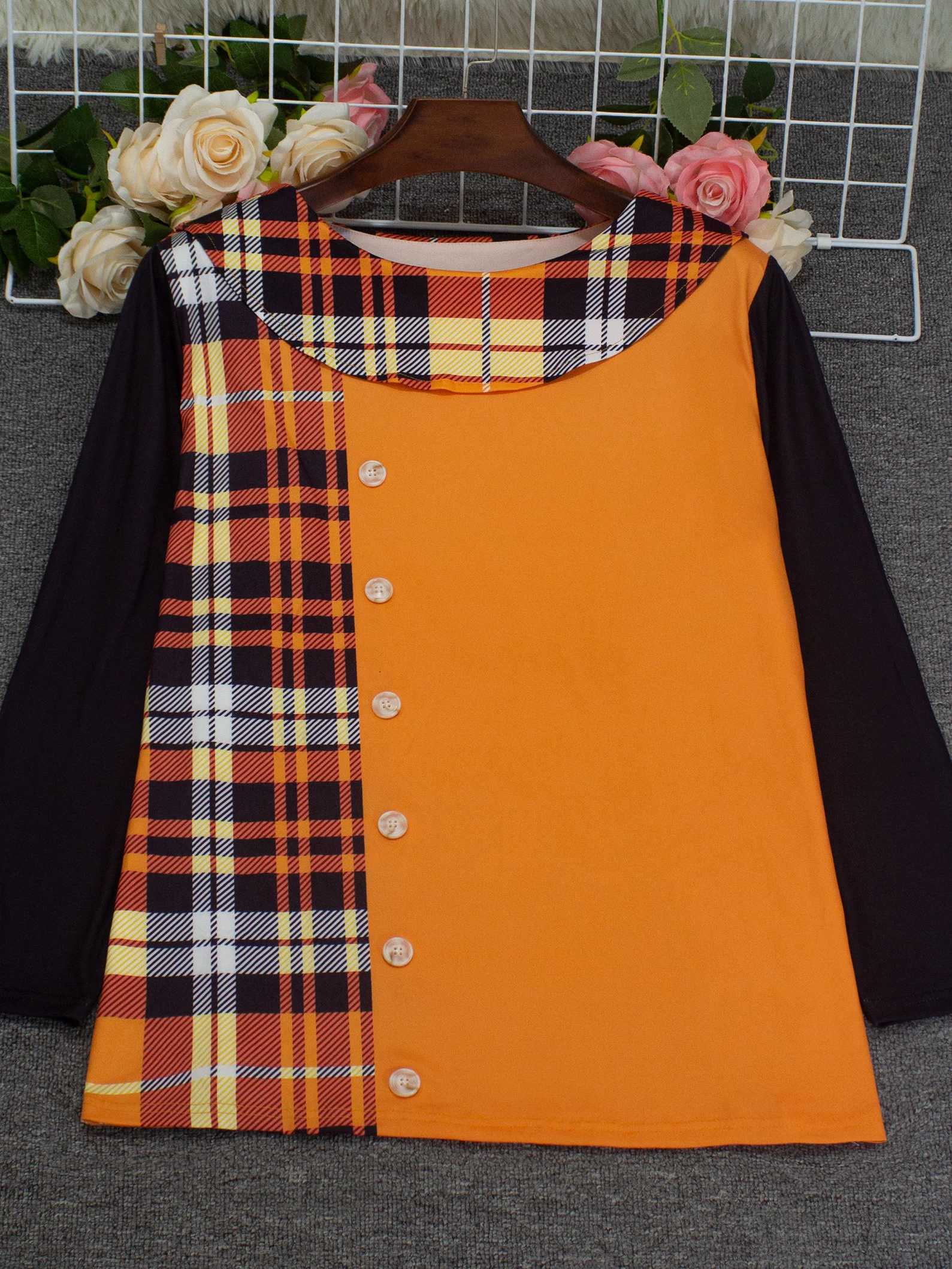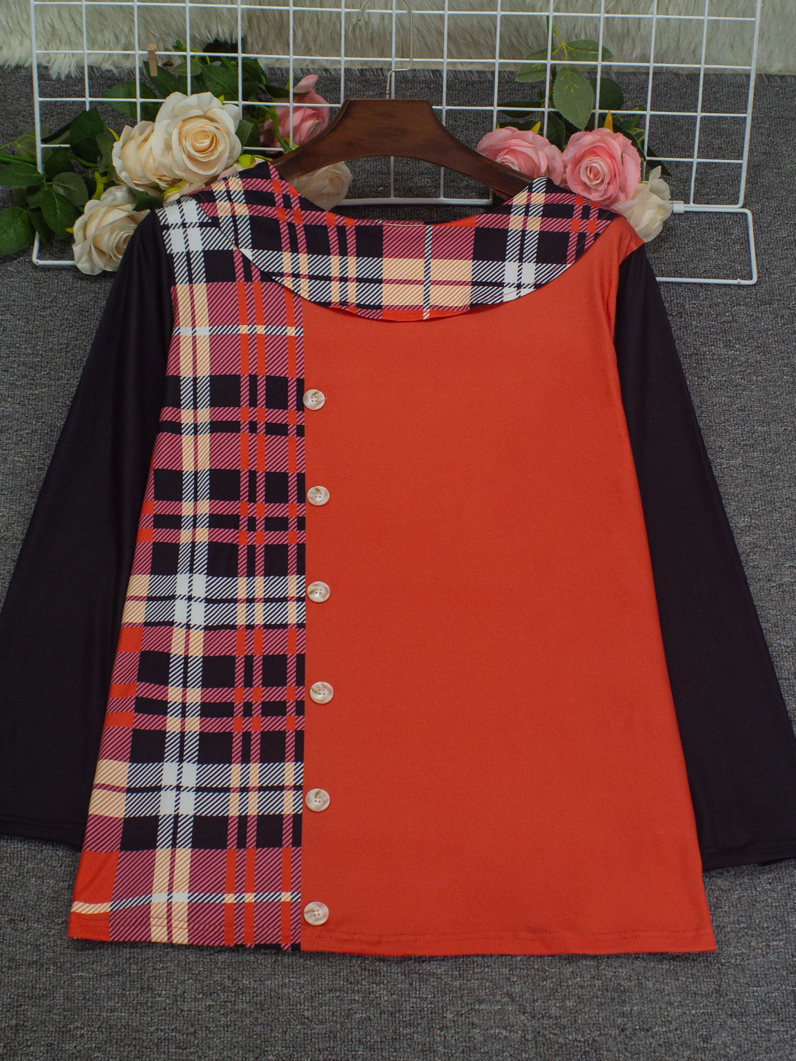 Women Plus Size Long Sleeve T Shirt Plaid Color Contrast Floral Print Round Neck Button Front Autumn Casual Top