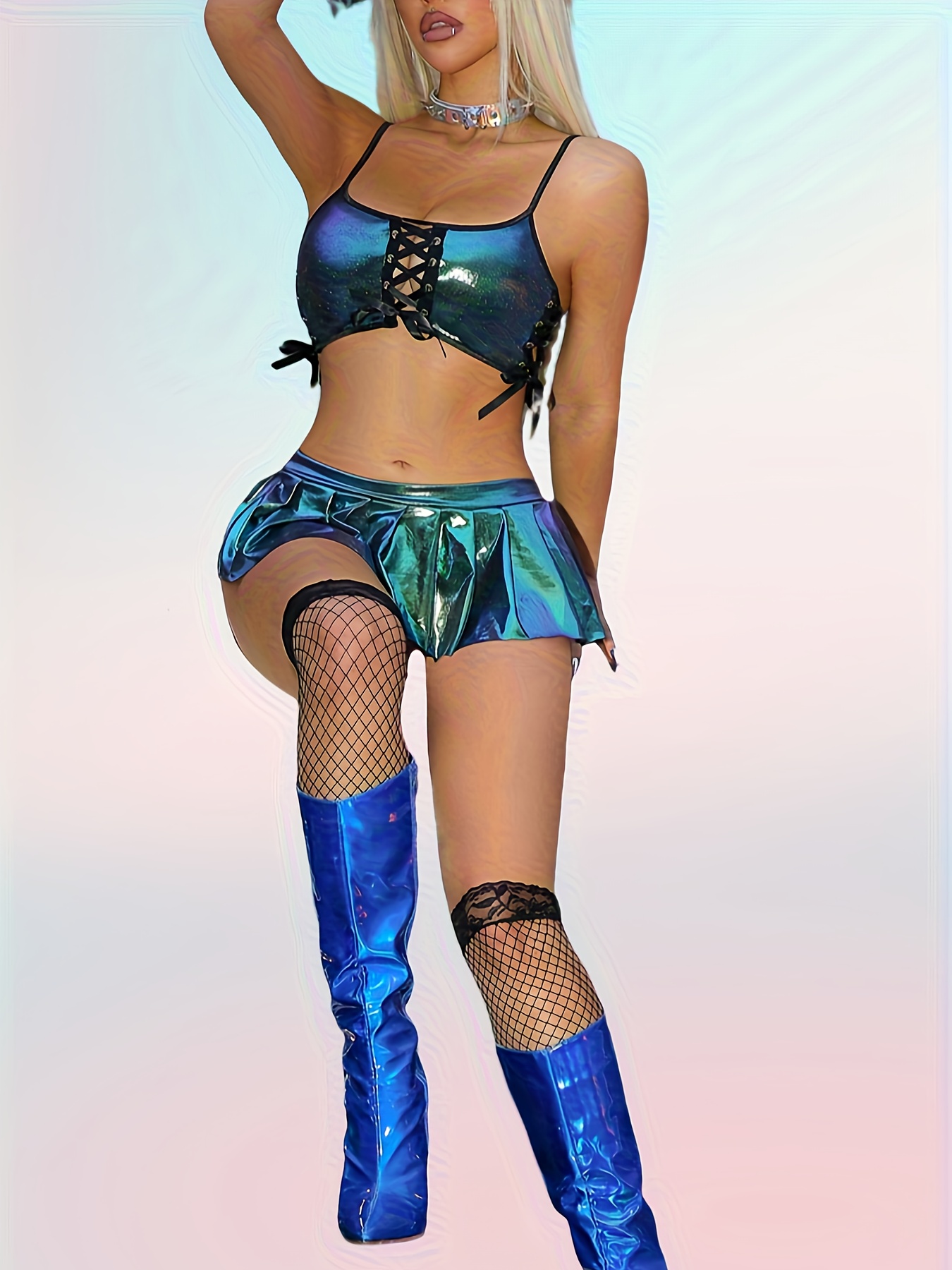 Women’s Hot Style Sparkling Pleated Eyelet Tie Sexy Lingerie Set Top + Skirt
