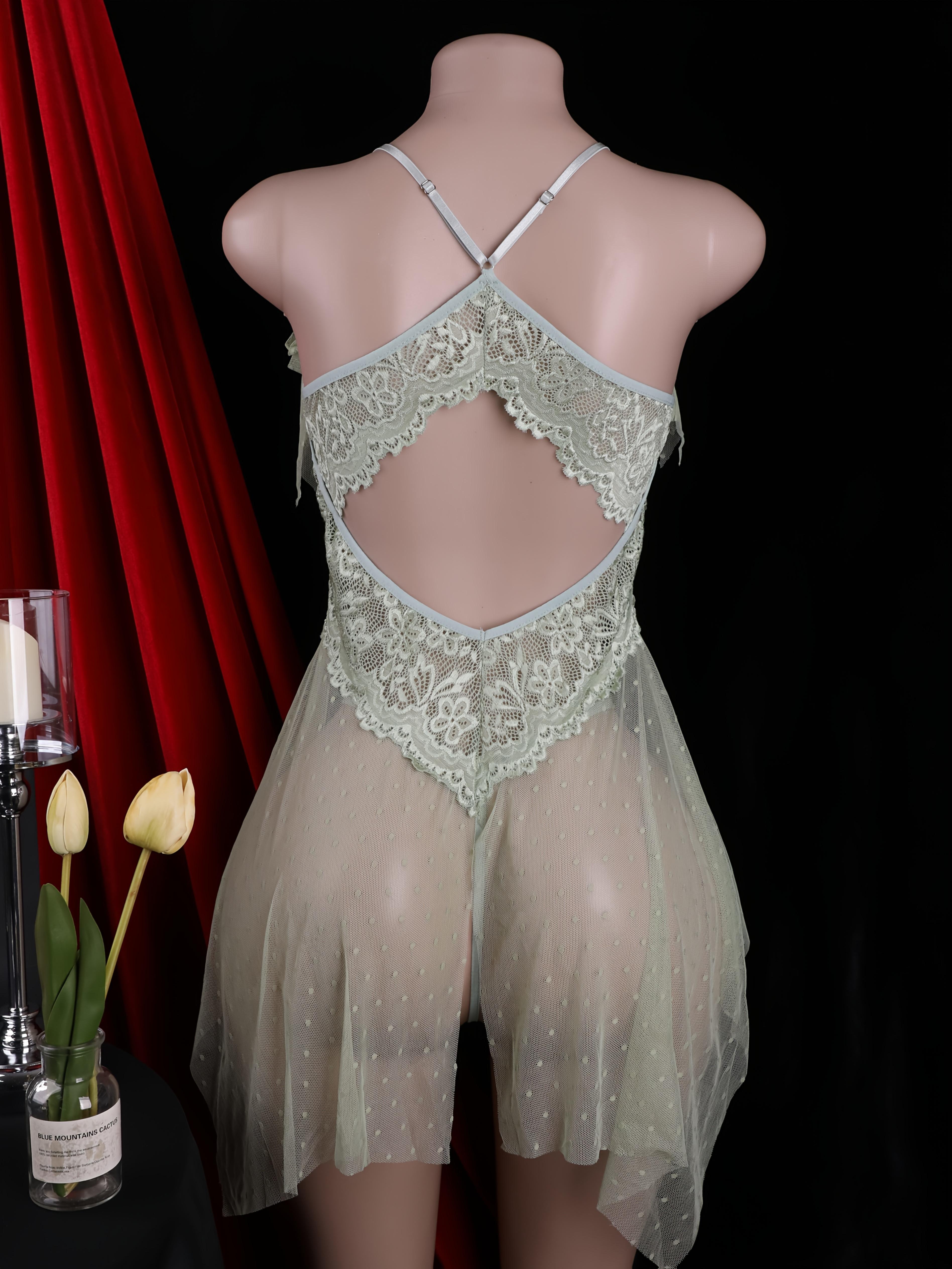 Women’s Nightwear, Two-Piece Robe Set, Solid Color Semi-Transparent Lace Deep V Chest-Exposing Polka Dress, Hot Thong, G-String, with Garter Belt, Boudoir Outfit, Seductive Sleepwear, Lace Lingerie, Sheer Nightgown, Breathable Material, Delicate Lace