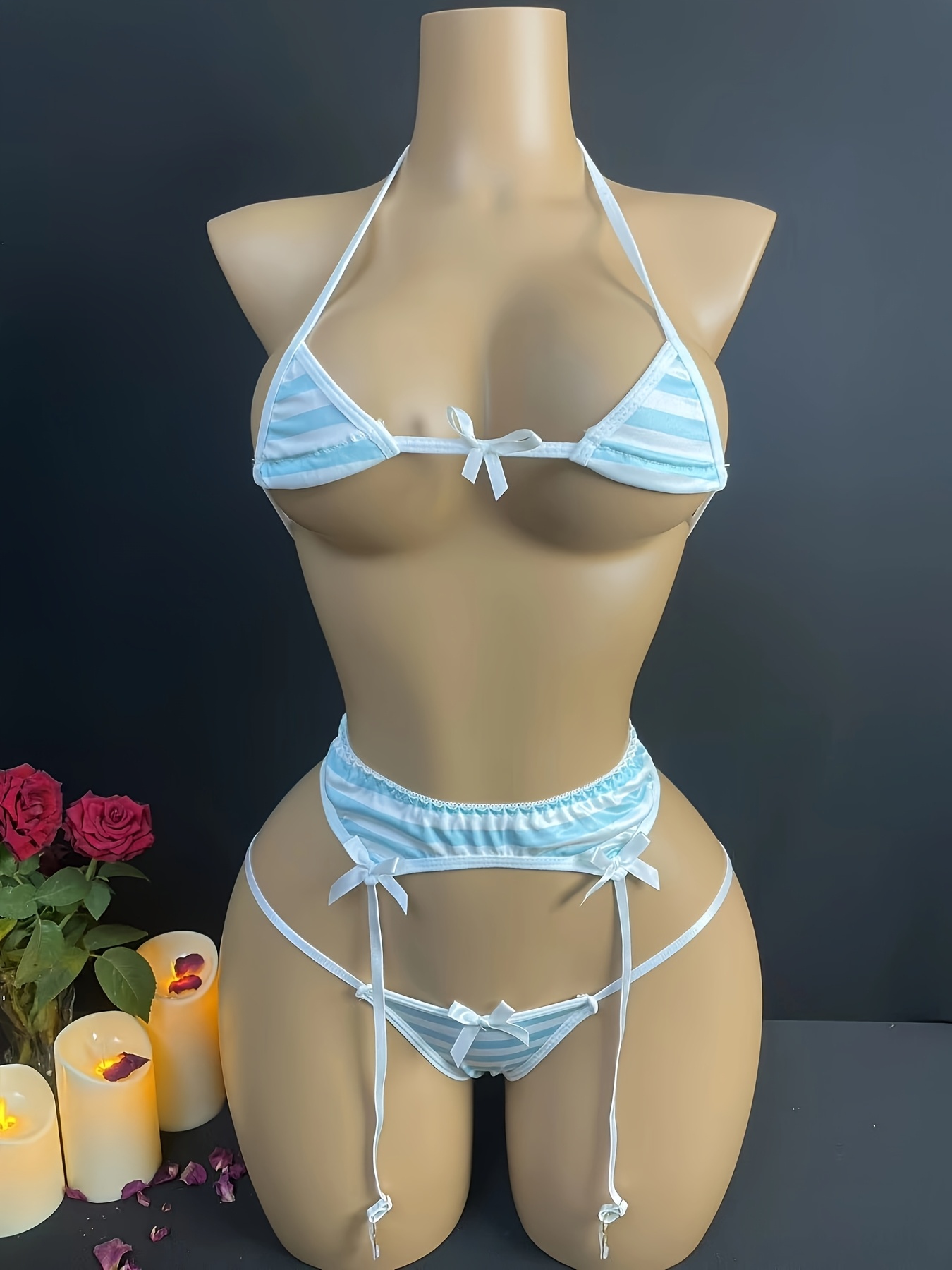Women’s Striped Beach Bikini Lingerie Set with Garter Straps – Ultra- Intimate Three-Piece Swimsuit