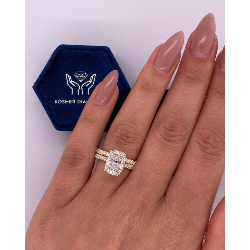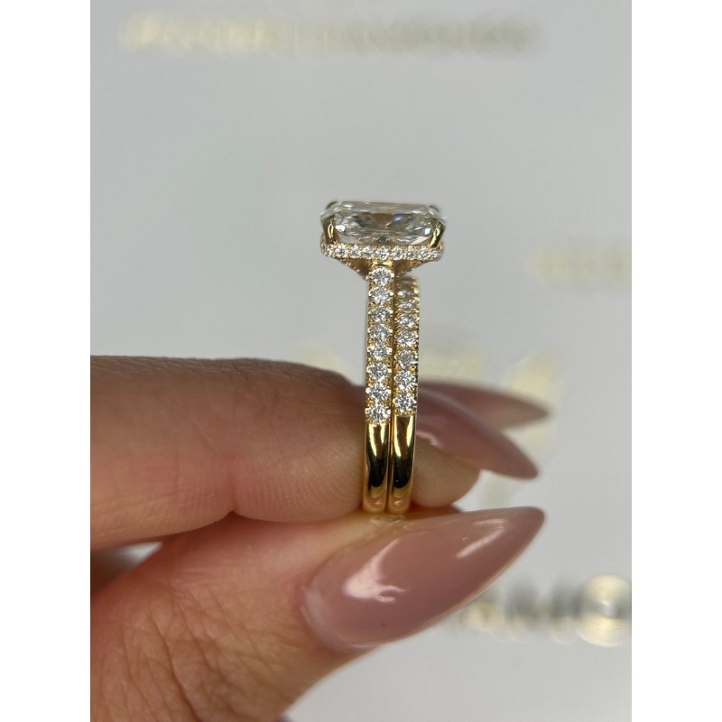 “There is a breathtaking weight and presence to a 3.5-carat stone. When you first slide the engagement ring on, you’ll notice how the elongated shape elegantly follows the line of your finger, making it appear longer and more slender. The E-color grade means the stone looks like a drop of pure, icy water—no yellow tones, just crisp, white fire. What truly delights is the ‘hidden’ detail; as you move your hand throughout the day, the hidden halo catches the light in a subtle, playful way that only you might notice at first. Wearing it with the matching band makes the set feel complete and solid, a constant, sparkling reminder of a significant promise. It’s a piece that feels both grand for a wedding and effortlessly chic for daily life.”