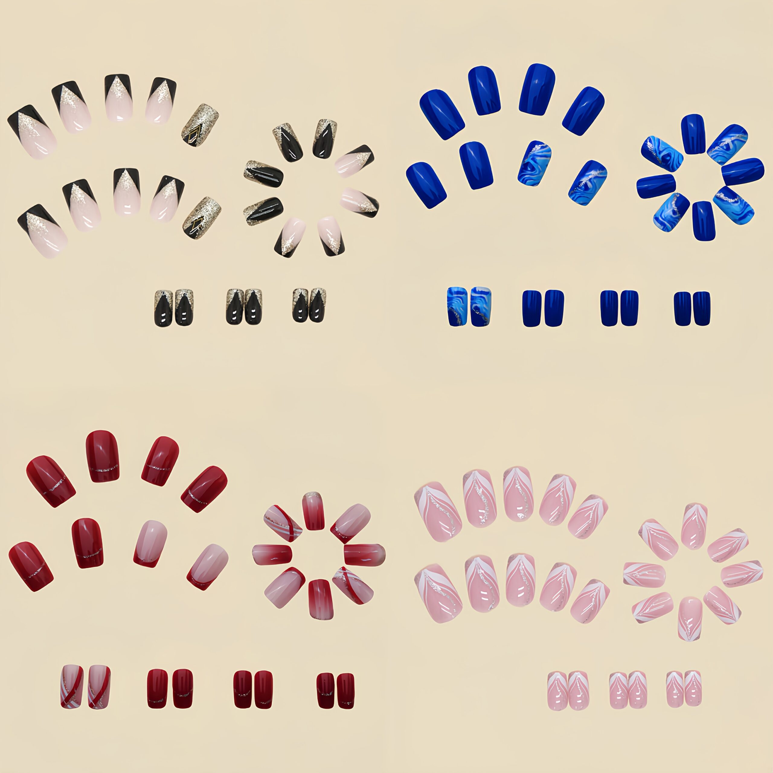 The Designs: This set features a curated mix of four primary colors. Enjoy the “Moody Noir” of glossy black, the “Oceanic Depth” of gradient blue, the “Sultry Crimson” of classic red, and the “Romantic Blush” of soft pink. Accents include modern geometric stripes and seamless ombre transitions.