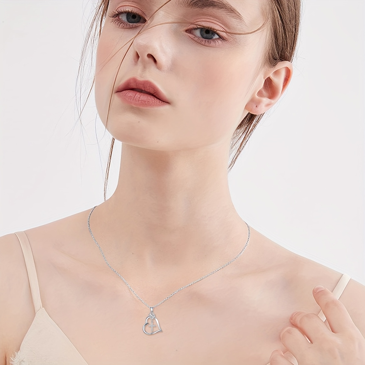 “There is a lightness and a warmth to this necklace that makes it feel like a personal talisman. When you first fasten the chain, the silver feels cool against the skin, quickly warming to your body temperature. The real magic happens when the light hits that center diamond—it doesn’t just sparkle; it throws off tiny rainbows that catch your eye in the mirror. It’s a piece that invites conversation. You’ll find yourself instinctively reaching up to touch the smooth curves of the heart throughout the day. Whether it’s tucked under a professional blazer or worn over a simple black dress, it provides a quiet sense of confidence. It feels like wearing a secret reminder of what you believe in and who you love, wrapped in a shimmering, high-end finish.”