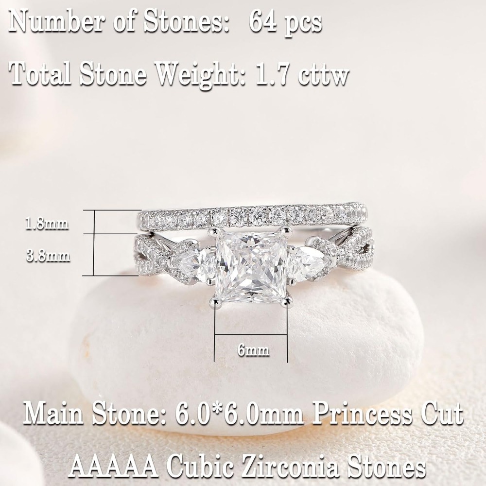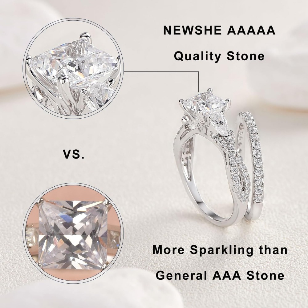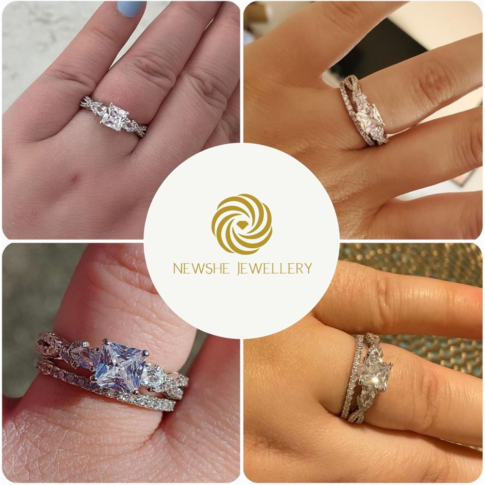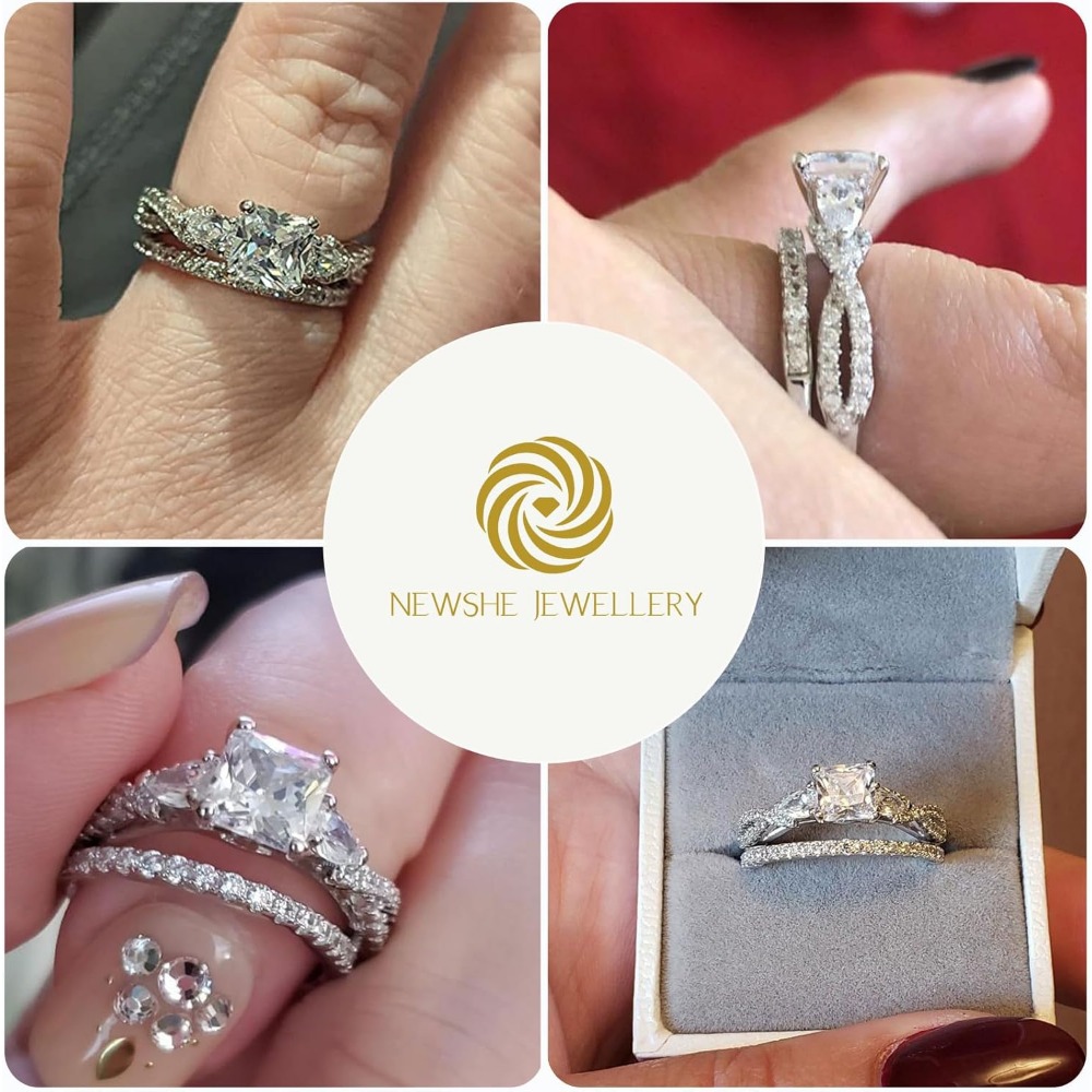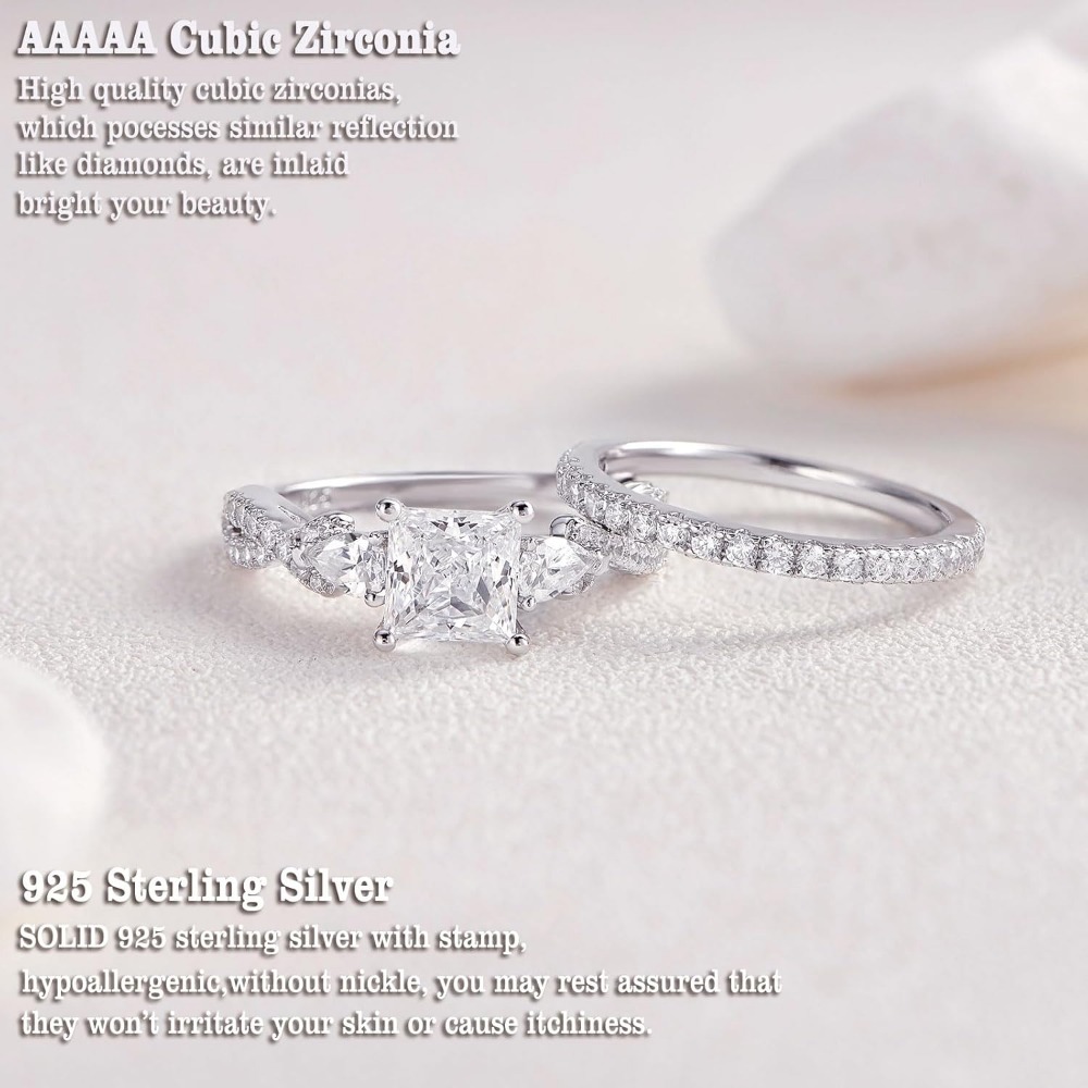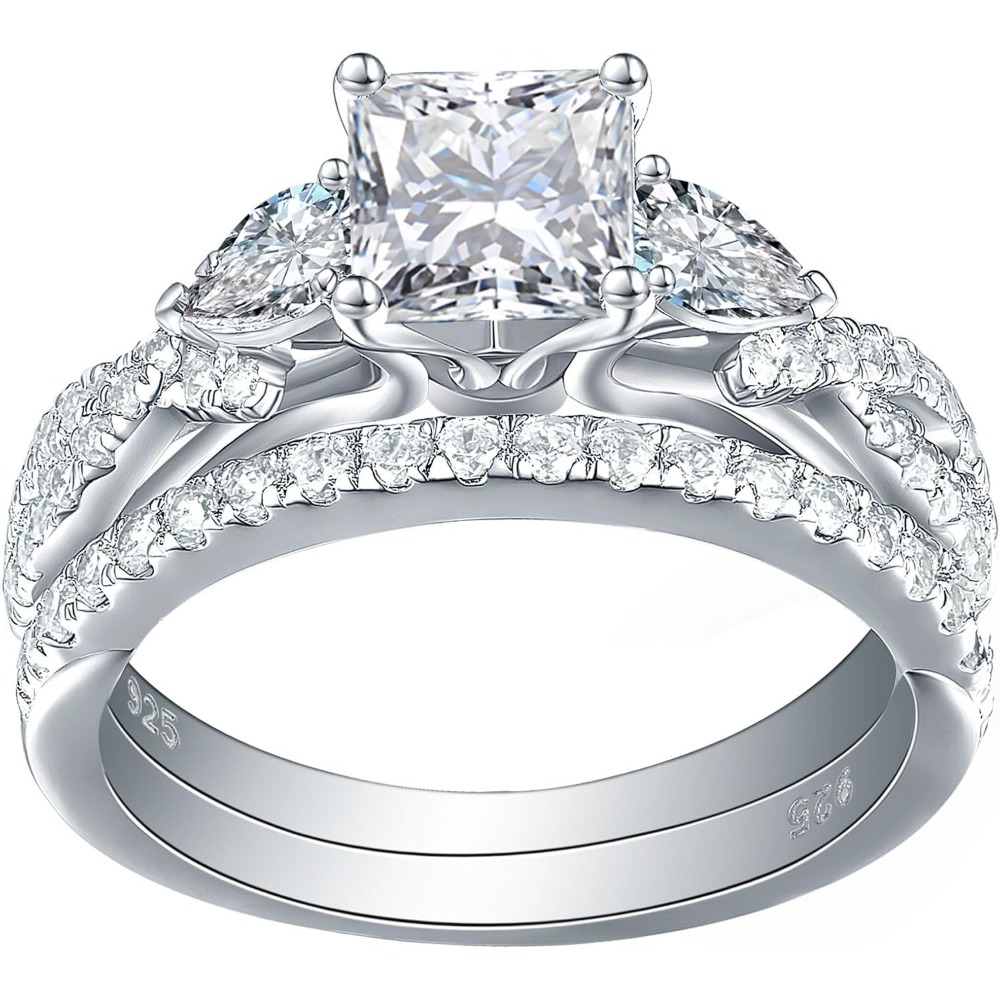 Dual-Cut Geometry: The engagement ring centers on a high-brilliance Princess-cut Cubic Zirconia, known for its modern, “crushed ice” sparkle. The accompanying wedding band is adorned with delicate Pear-cut accents, creating a floral, crown-like frame when worn together.