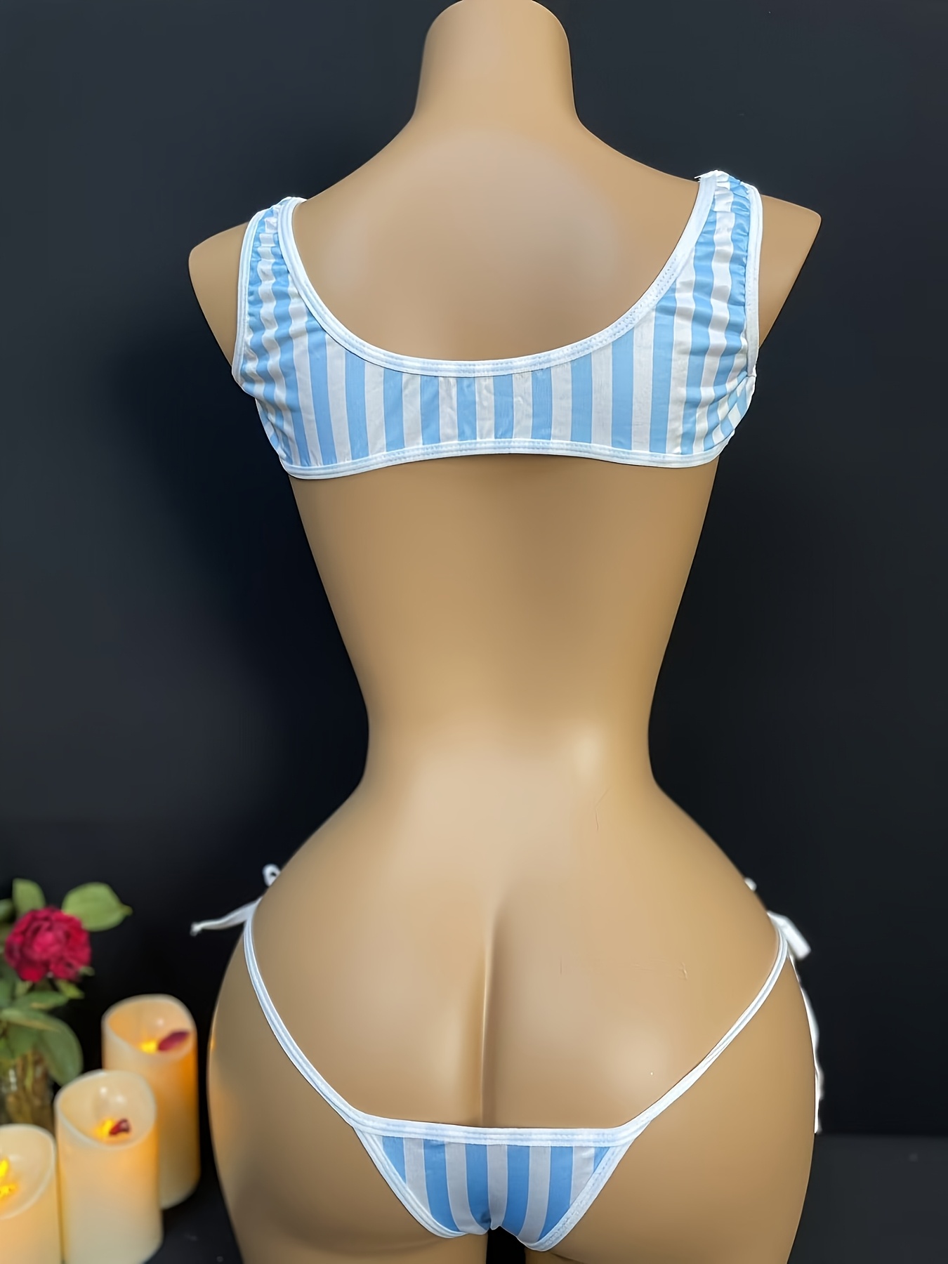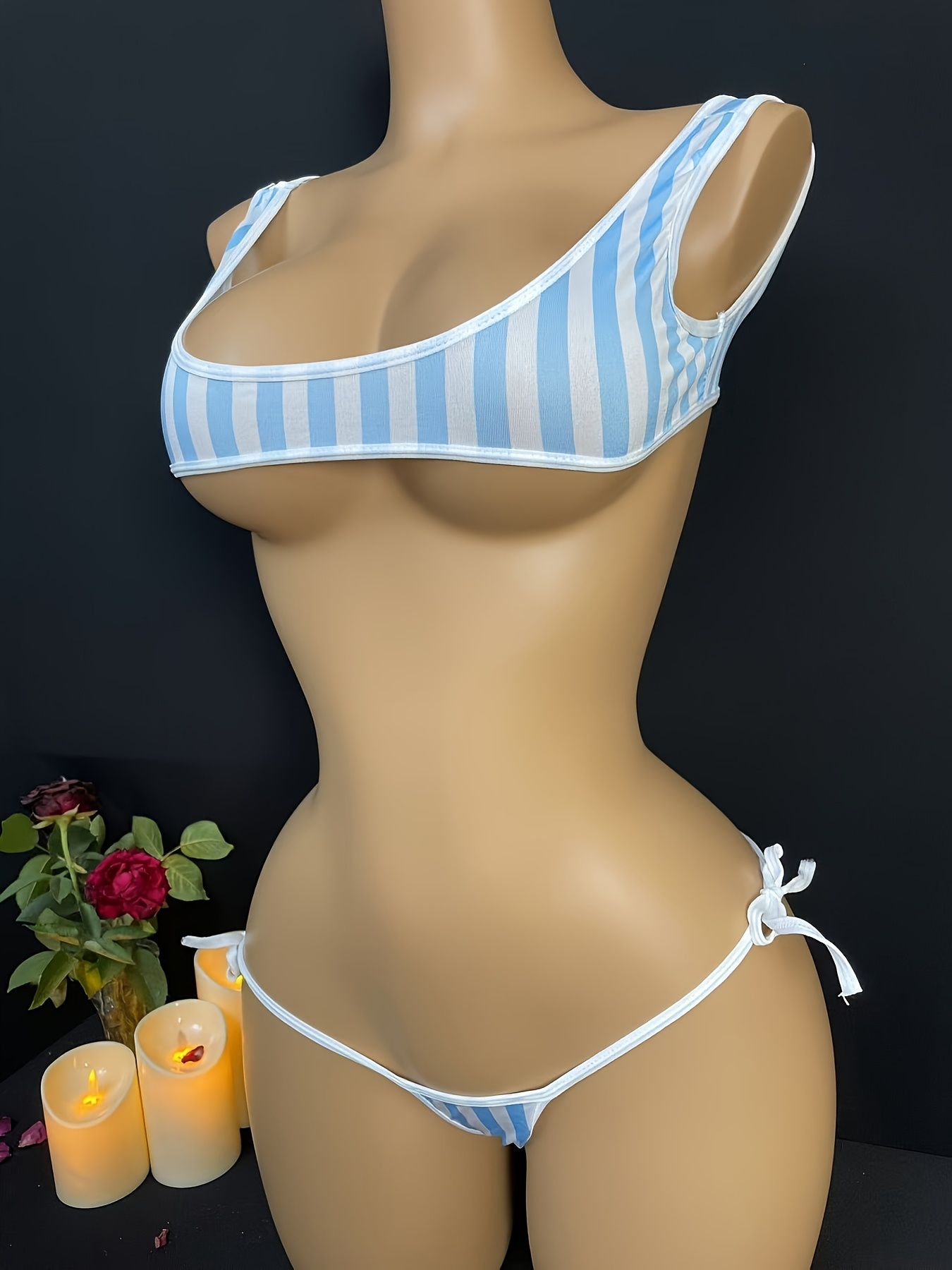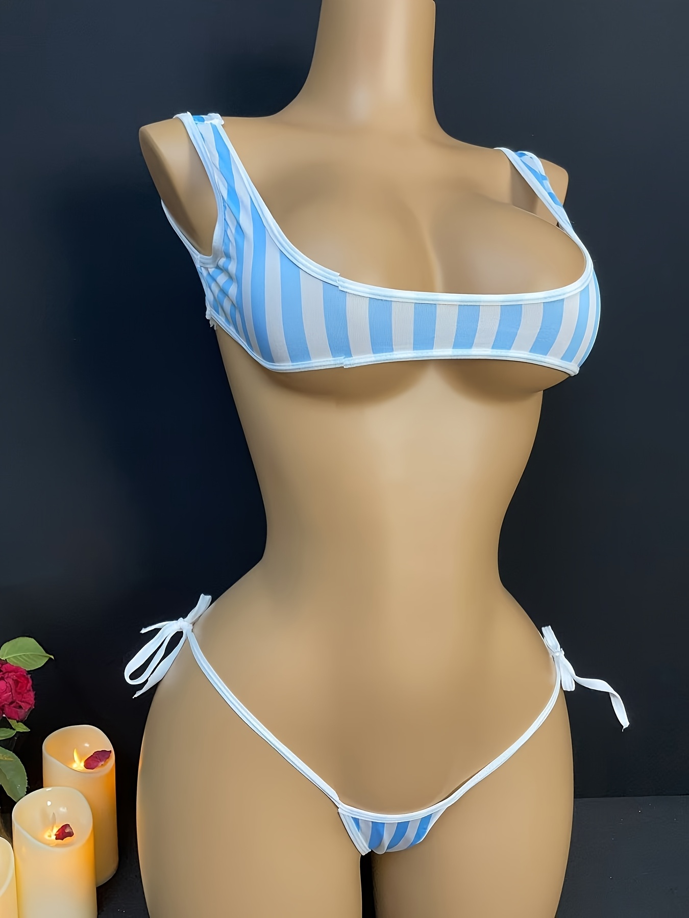 “There is something so fun and youthful about this set—it feels like a mix between a sporty beach bikini and something you’d see in a Japanese anime. The vest-style top is my favorite part; it feels much more secure than a standard triangle top, but the split in the middle keeps it incredibly sexy. I love how the stripes give it a ‘pop’ that stands out, even in low light. The fabric is super smooth, almost like water, and it has a great stretch that hugs you perfectly. It’s the kind of set that makes you feel playful and energetic, like you’re ready for a private summer photoshoot at home. It’s light, bold, and totally unique.”