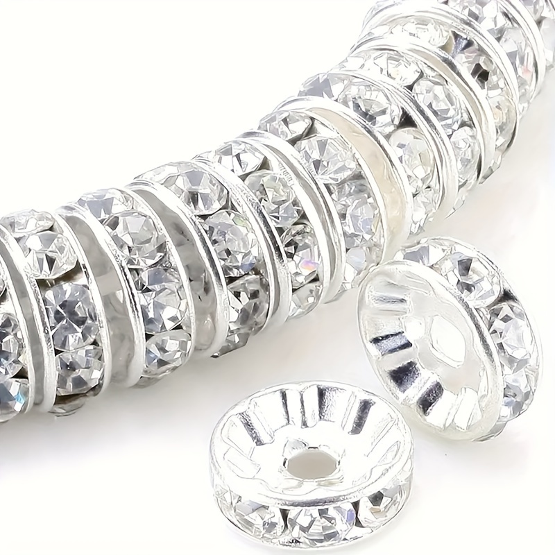 A premium bulk pack of 8mm Silvery Plated Czech Crystal Rhinestone Beads, designed as high-luster interval spacers for jewelry making. Featuring brilliant-cut round crystals and a tarnish-resistant silver finish, these rondelle beads are the perfect addition to DIY bracelets and necklaces, available in 100 or 600-piece sets.